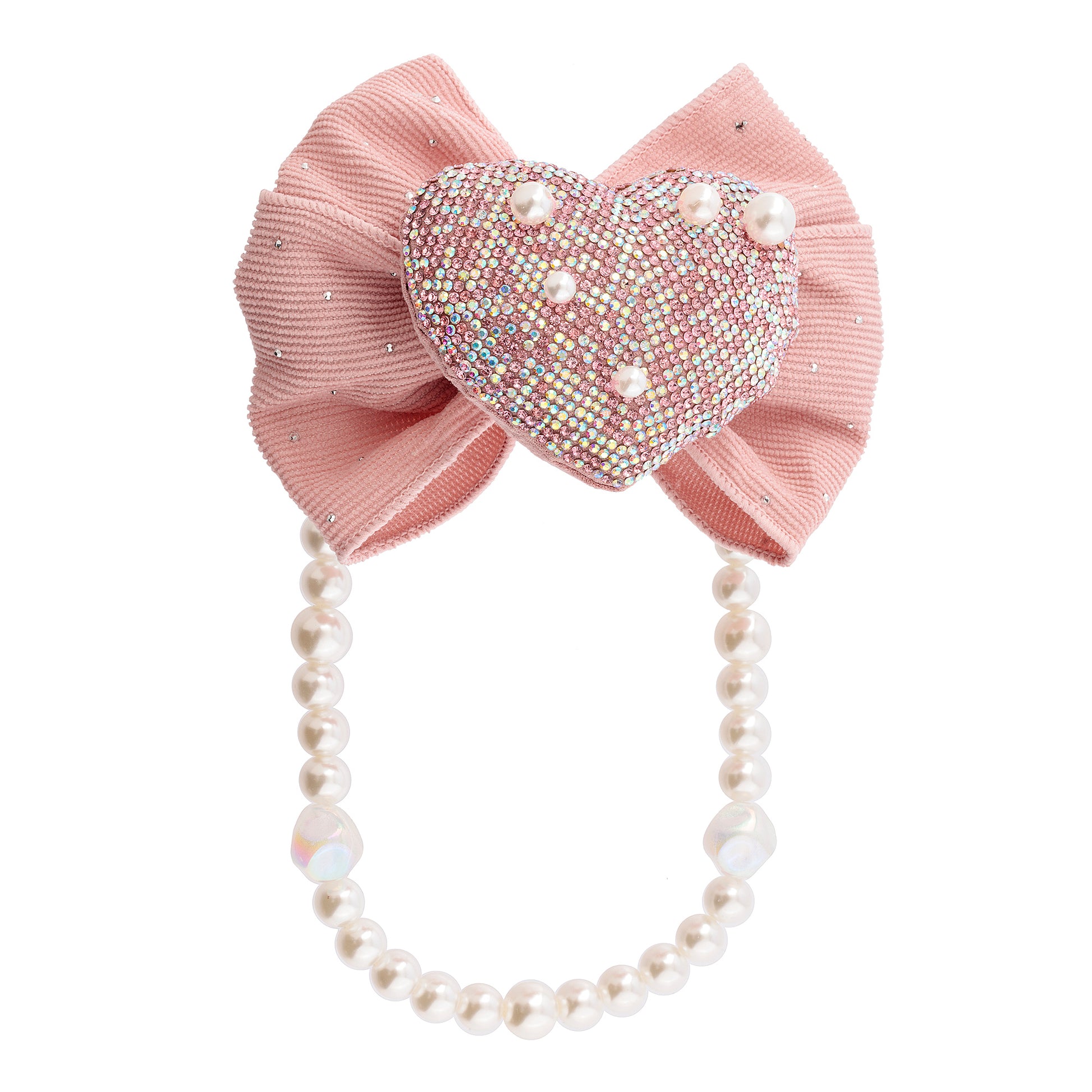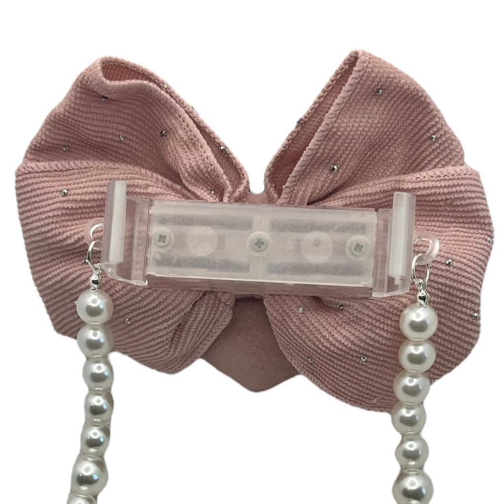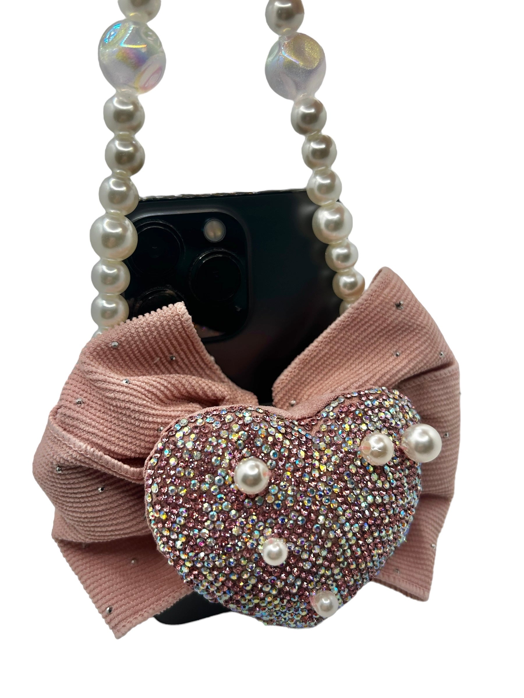 Acessório de suporte para carregar o celular - Feito de veludo com coração de enchimento, acabamento brilhoso e alça de pérolas.