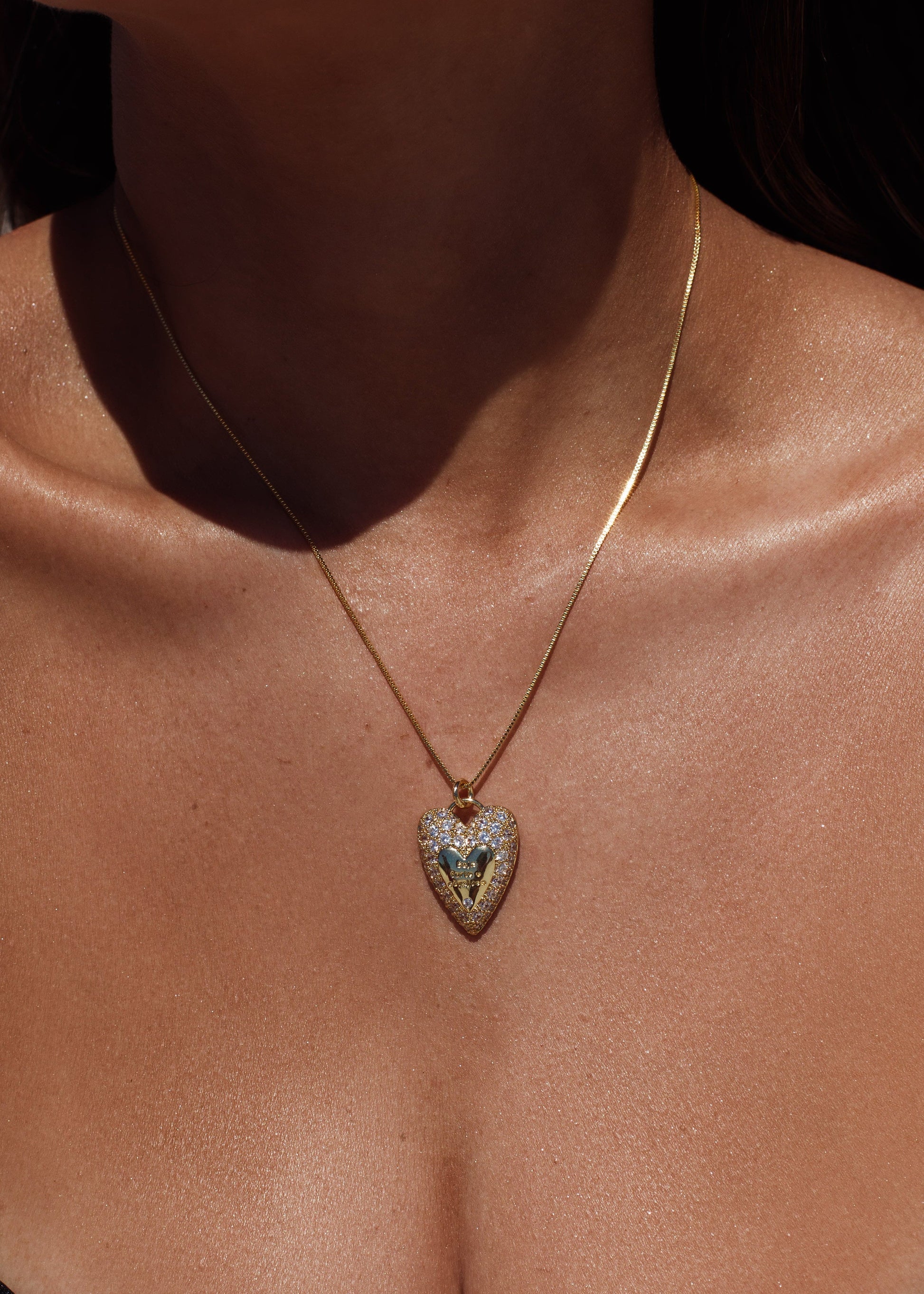 Colar com pingente em formato de coração, desenvolvido em liga metálica de alta qualidade e banho dourado. A peça possui inscrição “Seja forte e corajosa” e aplicação de micro zircônias cravejadas, garantindo brilho uniforme e acabamento refinado.