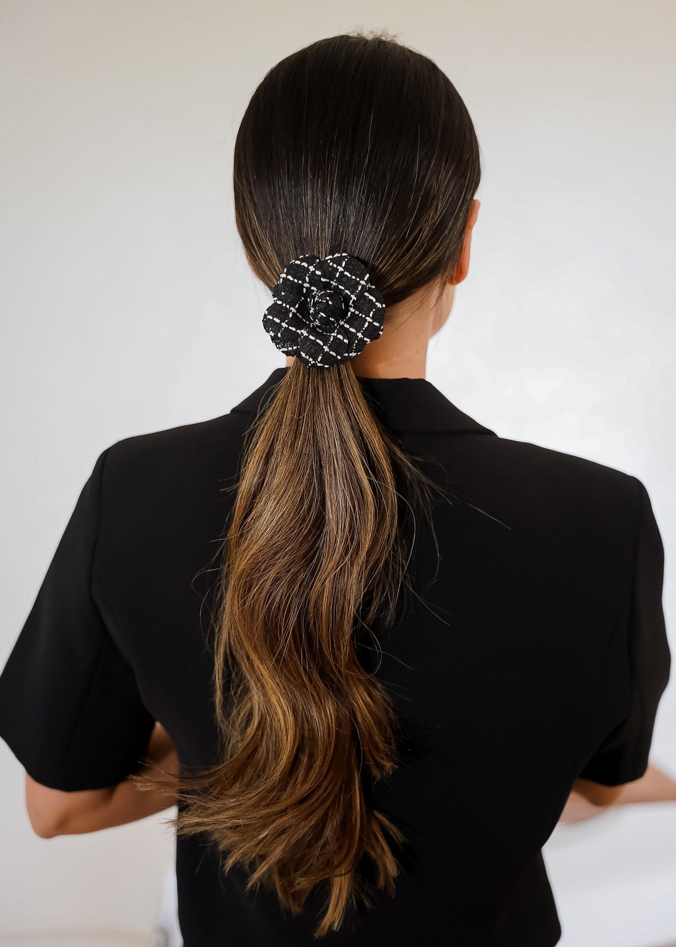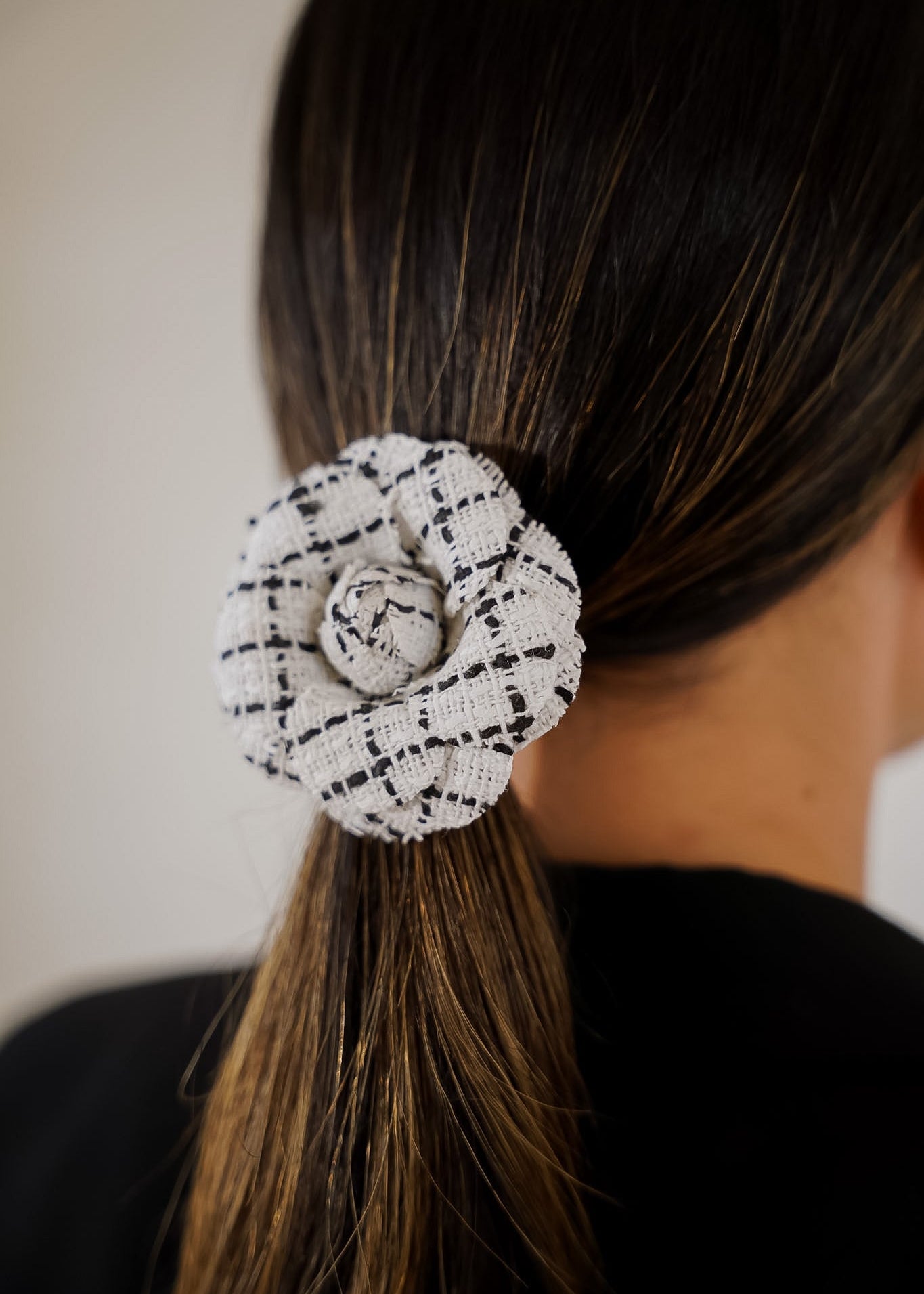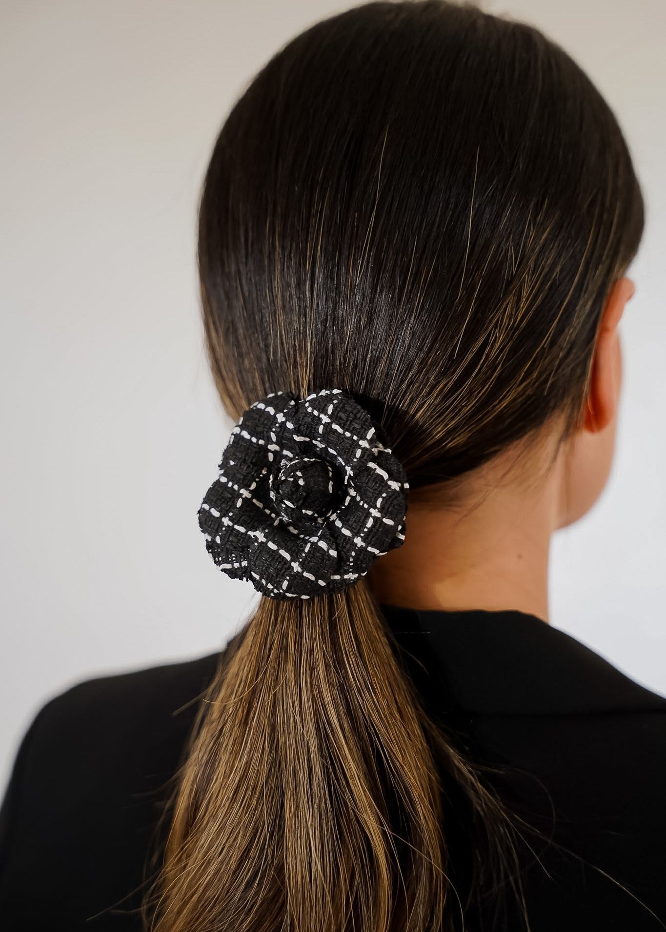 O amarrador traz uma flor volumosa em tecido estilo tweed, criando textura elegante e sofisticada para o penteado. A construção em pétalas estruturadas forma um visual marcante, inspirado em acessórios clássicos reinterpretados de forma contemporânea.