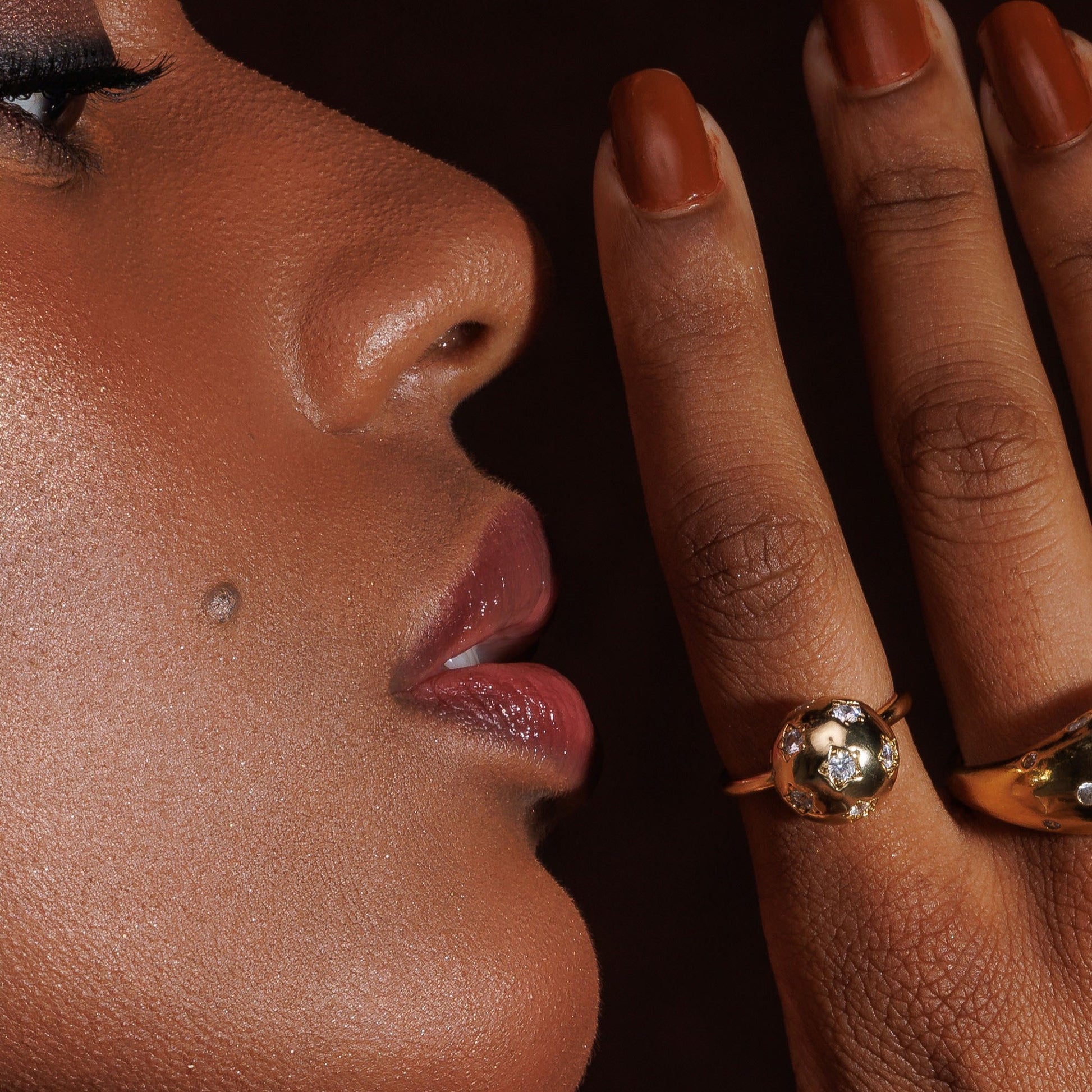 Descrição: Anel de esfera com pontos cravejados em zircônia cristal