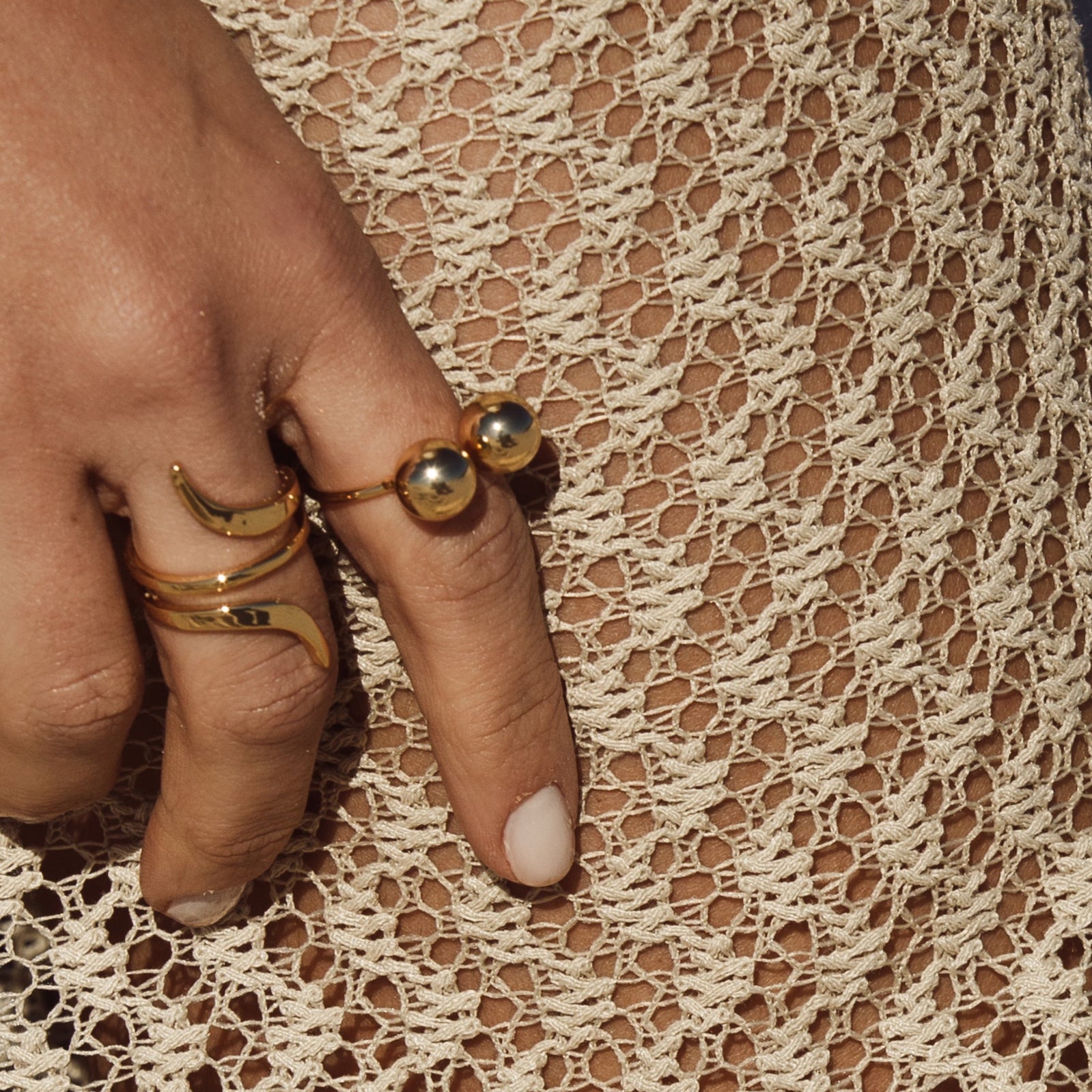 O Anel Esferas Duplas Lisas Dourado é uma peça moderna e versátil que traz um toque de estilo único para qualquer produção. Seu design apresenta duas esferas polidas em tamanhos diferentes, criando um visual elegante e contemporâneo. Ideal para ser usado sozinho como protagonista ou combinado com outros anéis para composições mais ousadas, ele é perfeito para quem busca sofisticação com um toque minimalista.