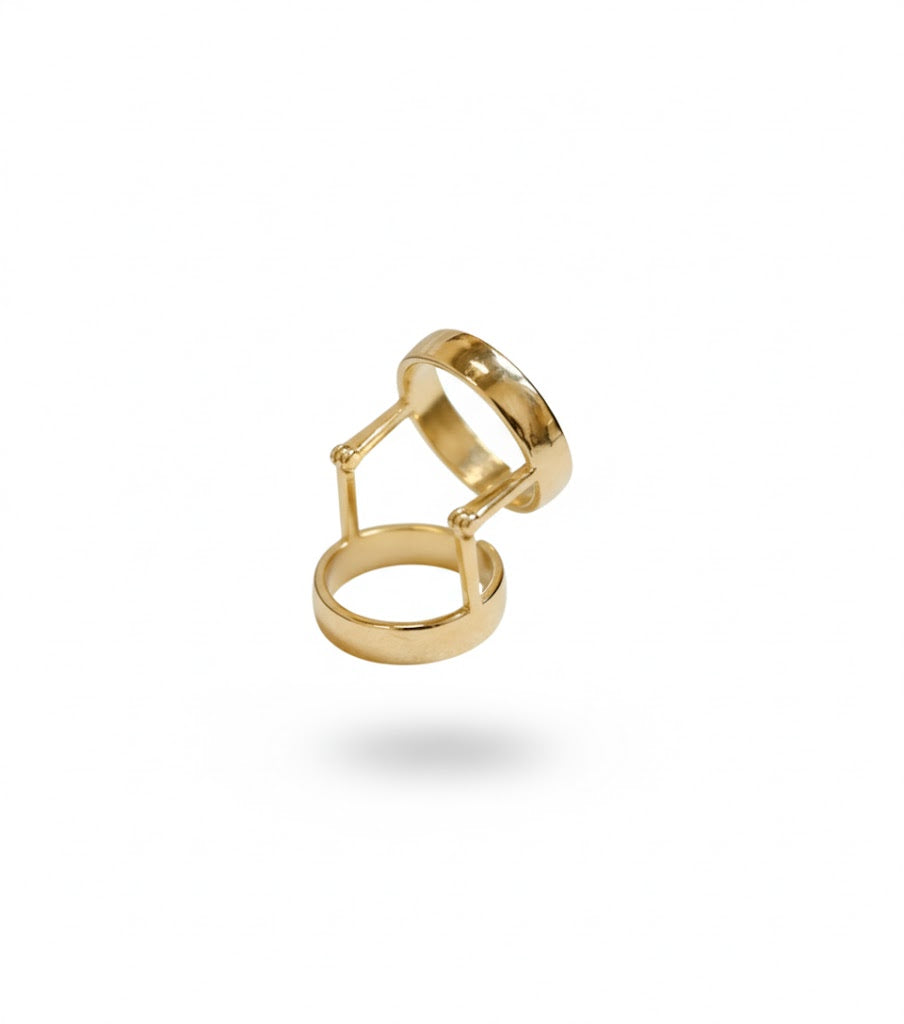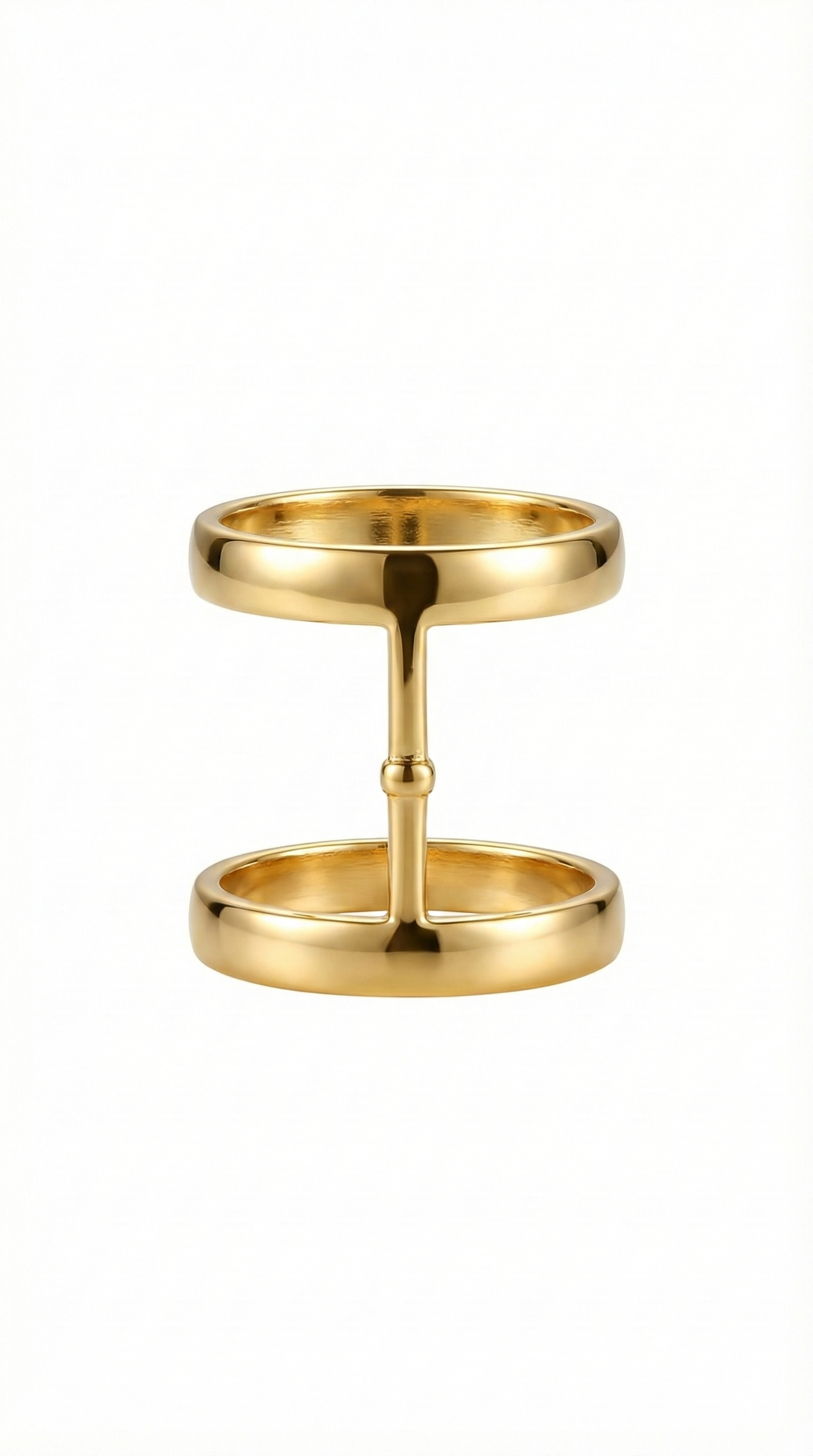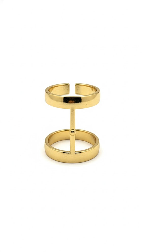 O Anel Estruturado Dourado Regulável é uma peça moderna, arquitetônica e super estilosa. Seu design possui duas bases conectadas por hastes metálicas, criando uma silhueta geométrica que foge do óbvio e traz um toque de originalidade ao look.