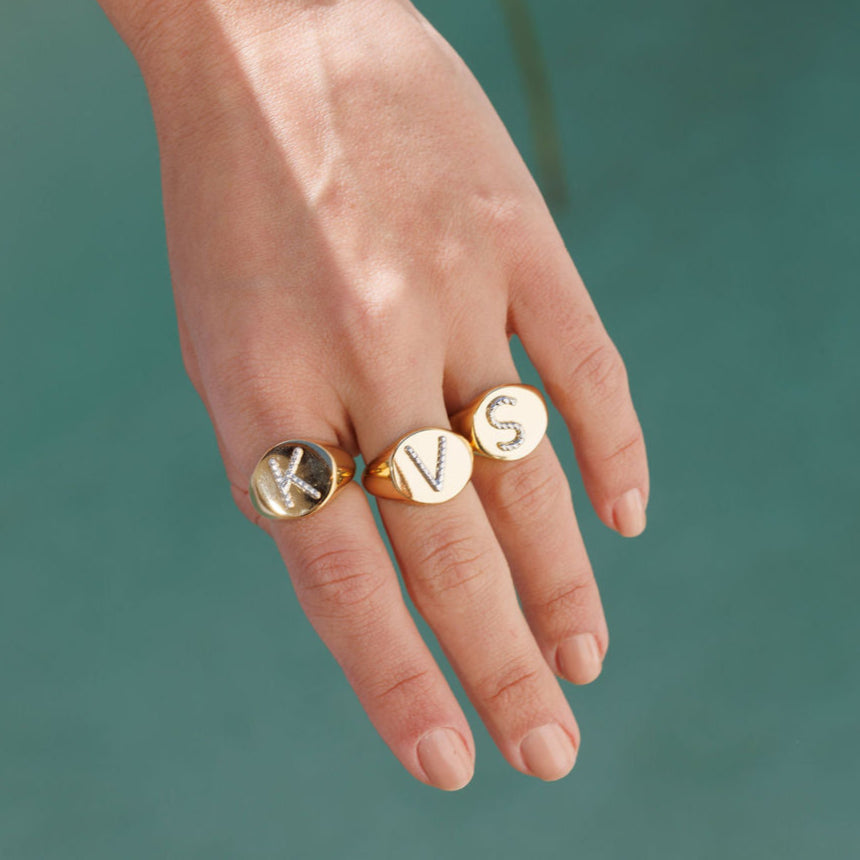 Descrição: Anel de tamanho com base dourada e aplicação de letra prateada