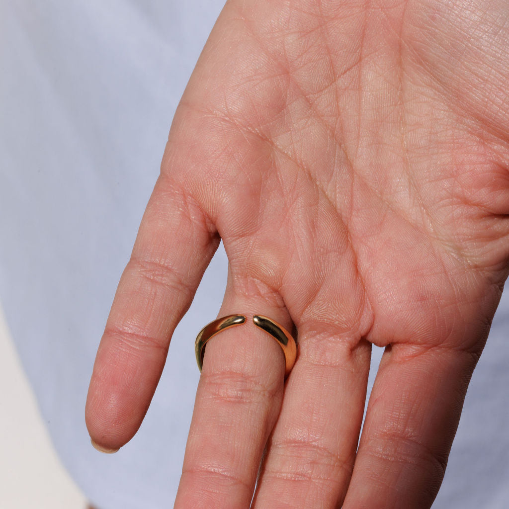 Descrição: Anel de tamanho com base dourada e aplicação de letra prateada