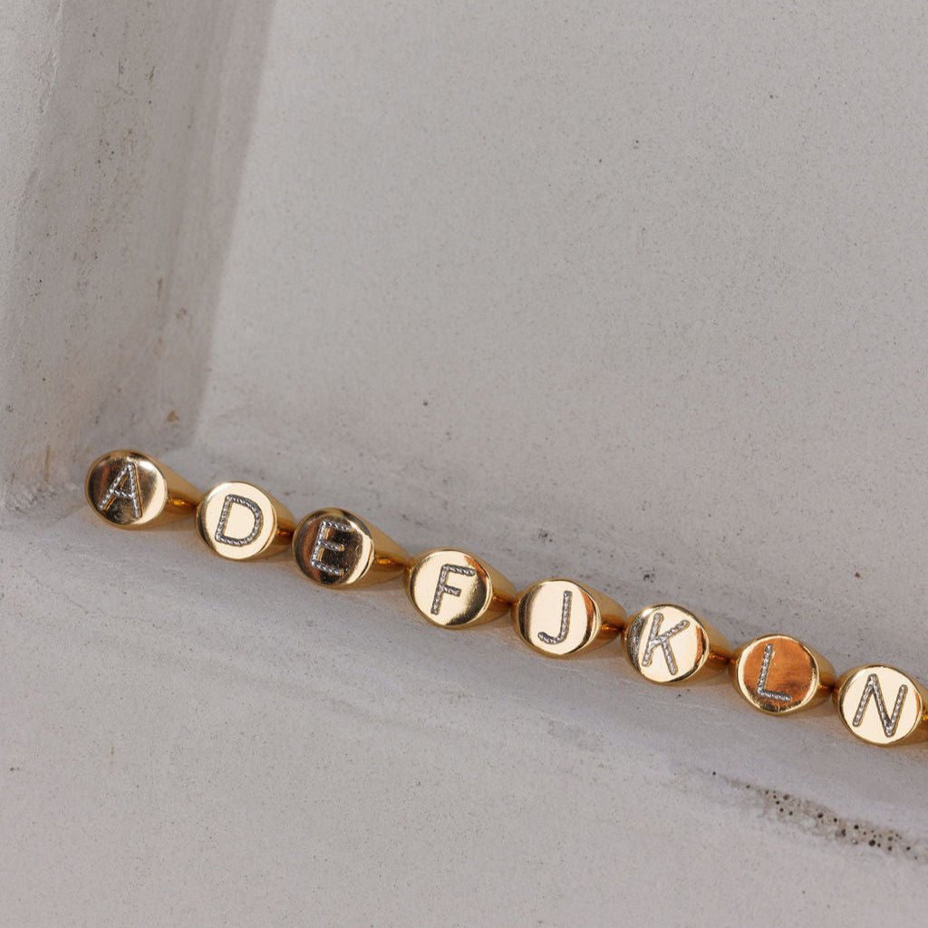 Descrição: Anel de tamanho com base dourada e aplicação de letra prateada