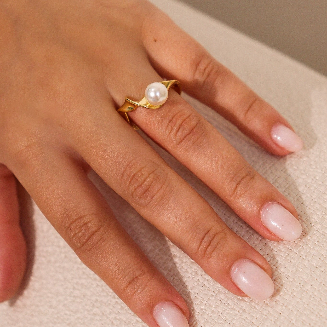 Descrição: Anel regulável, com formato enrolado e aplicação de pérola