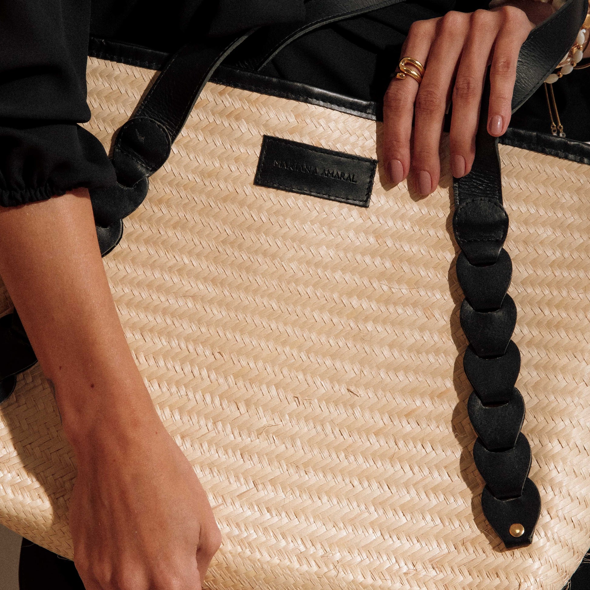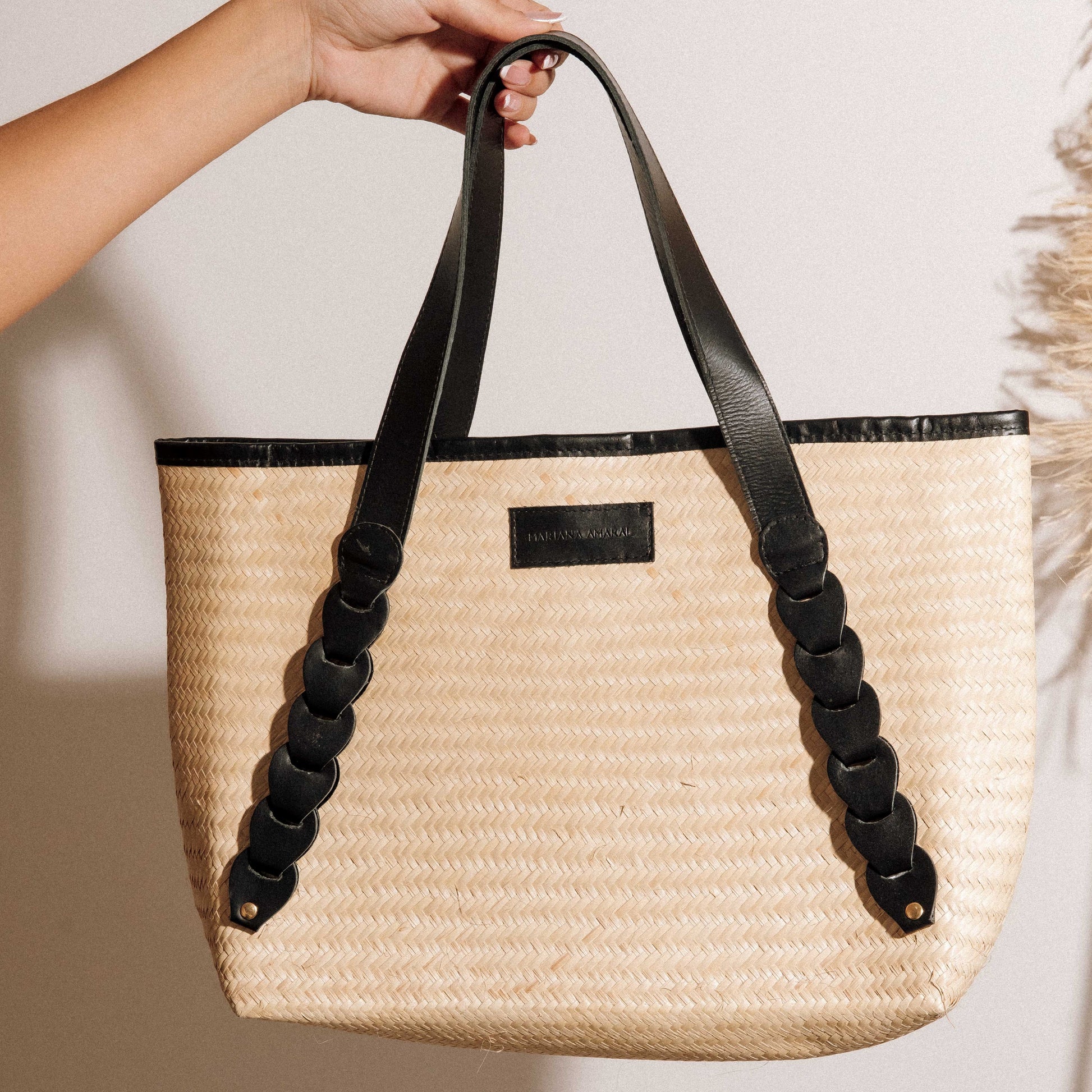 Bolsa Palha Com Couro Detalhe Trançado Preto