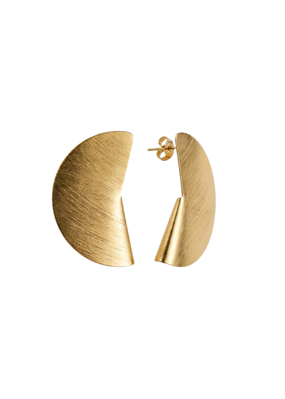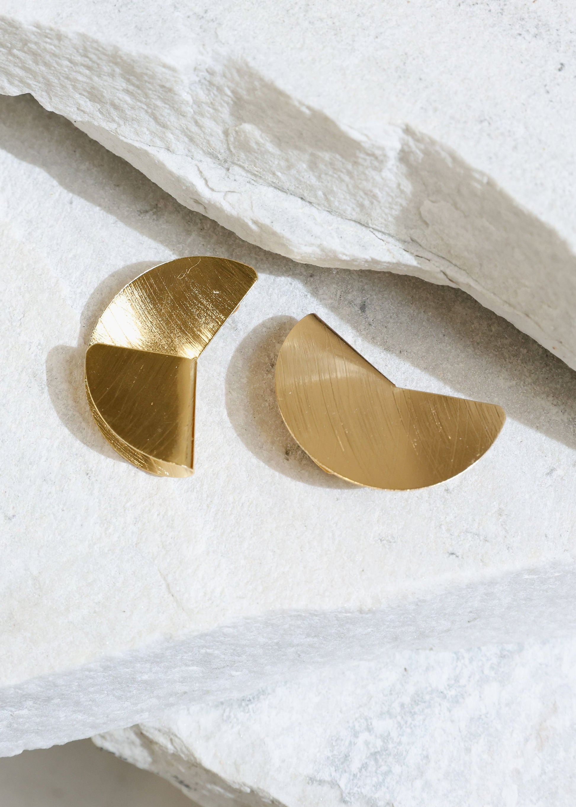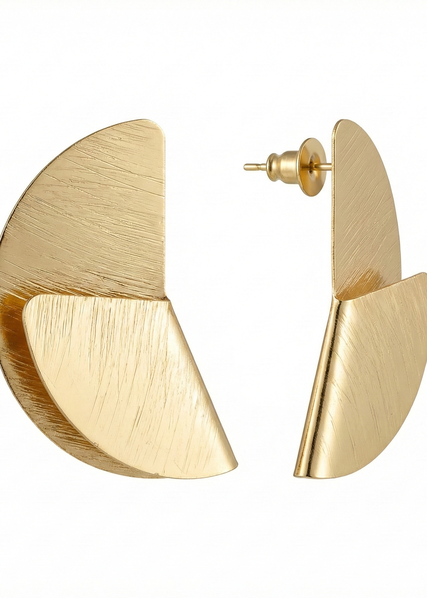 O Brinco Geométrico Dourado une arte e design em uma peça de impacto. Seu formato assimétrico em meia-lua cria um visual moderno, escultural e super elegante. Perfeito para quem ama acessórios statement com toque minimalista.