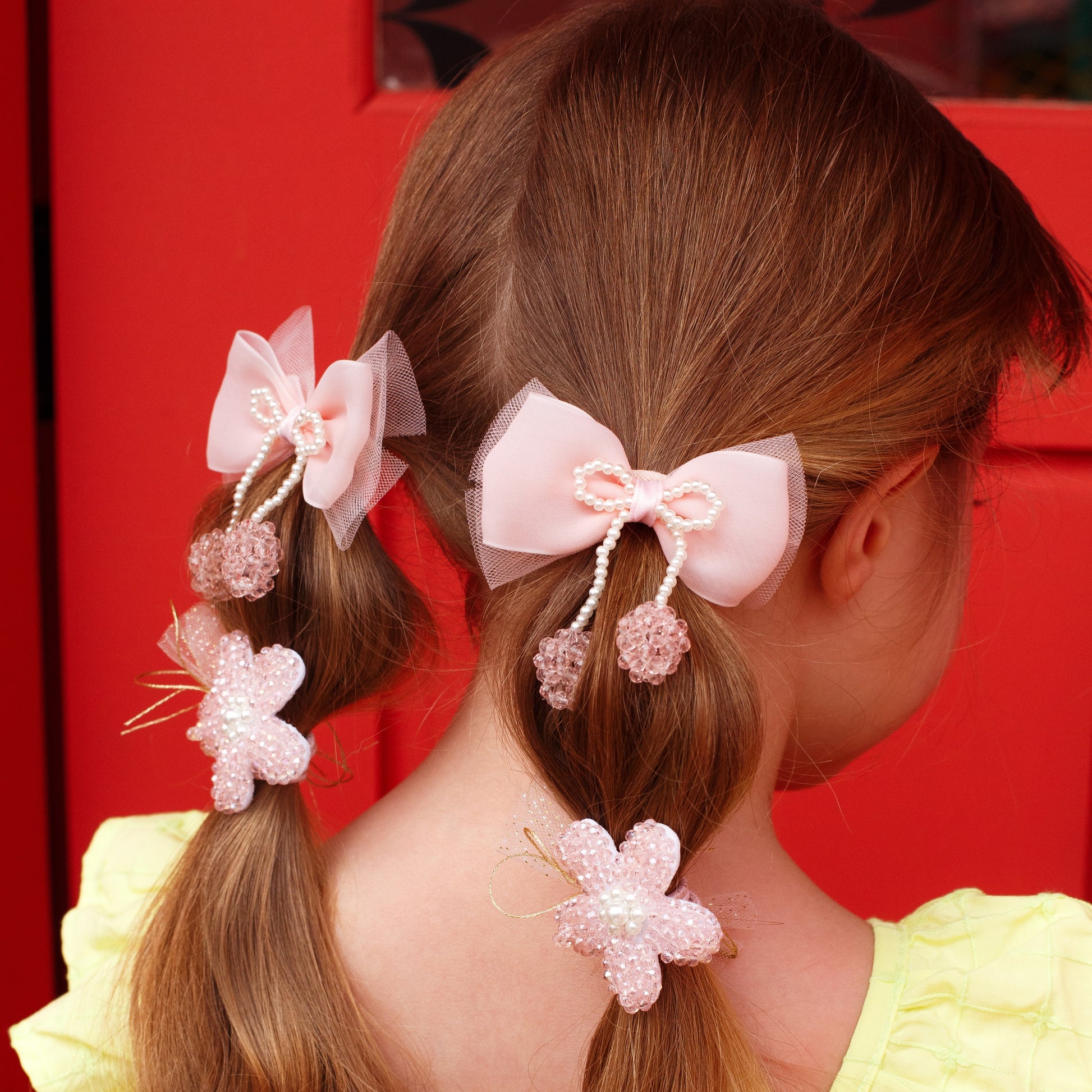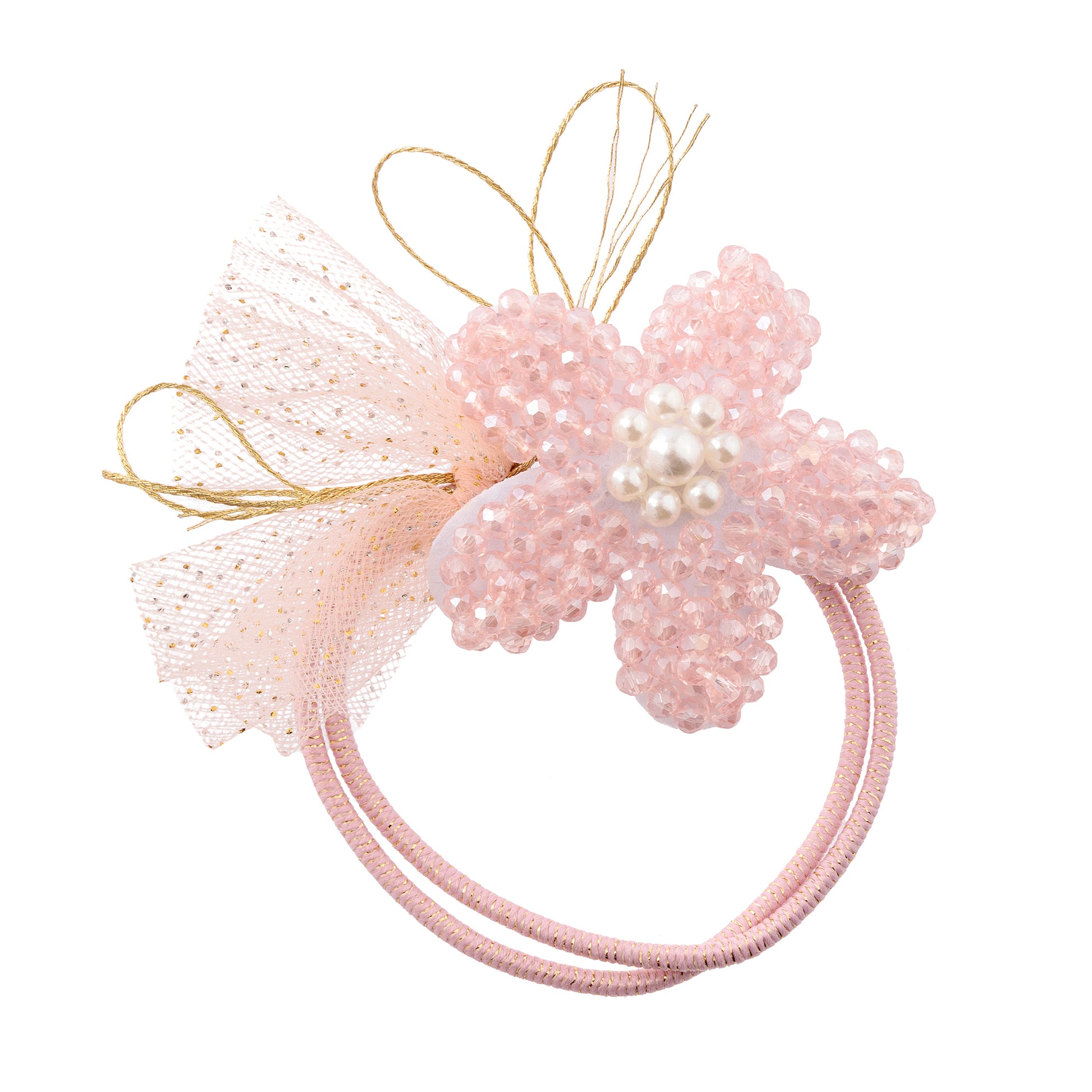 Descrição: amarrador de elástico com fio de brilho, flor bordada em cristais rosa e aplicação de pérolas. Detalhe com tule brilho e fio dourado.
