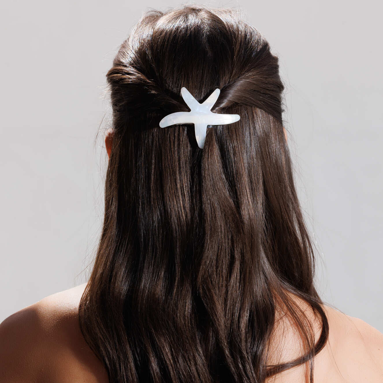 Descrição: Grampo de clique em formato de estrela do mar com estampa tartaruga/branco furta-cor