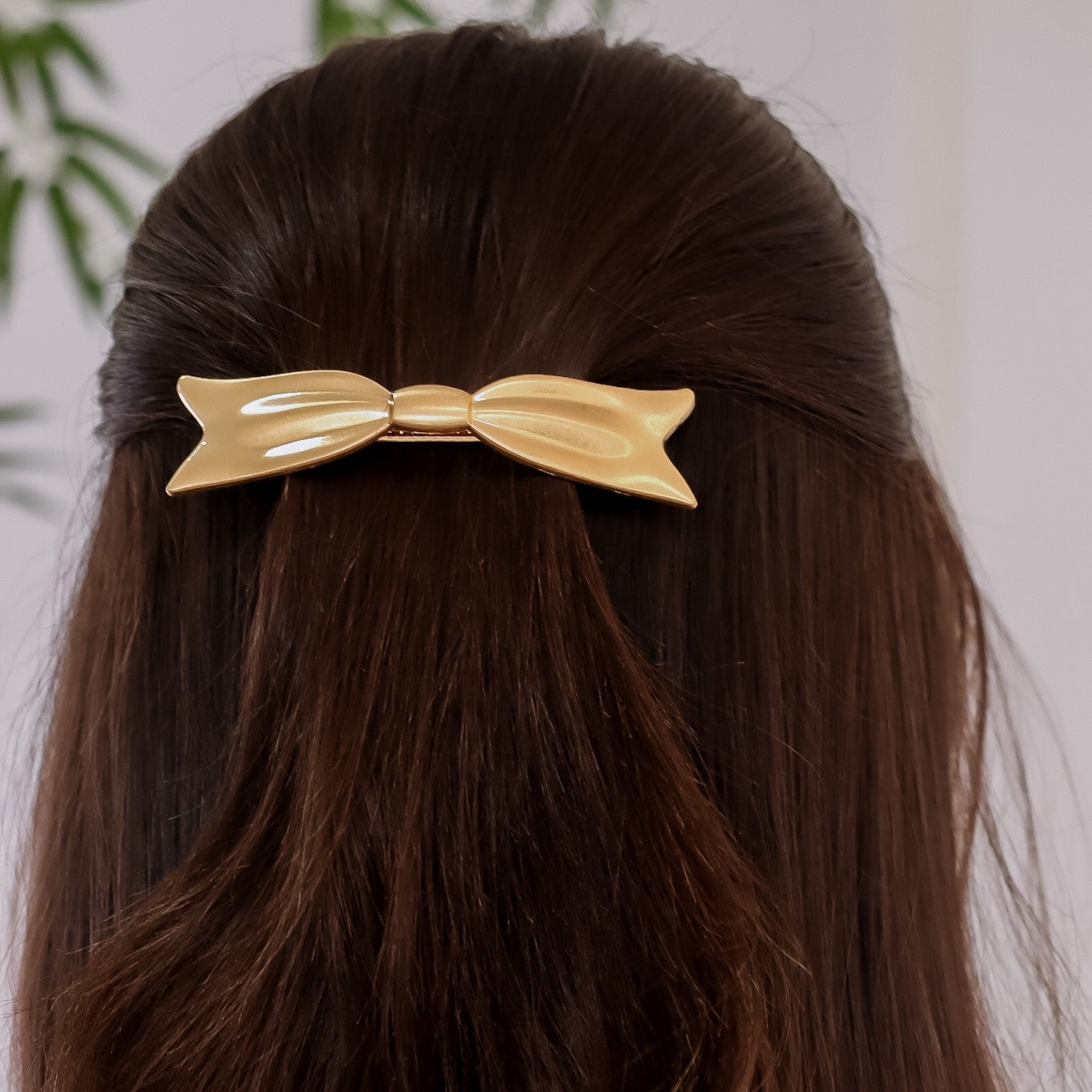 Descrição: Grampo de cabelo fecho click em formato de laço com textura escovada cintilante
