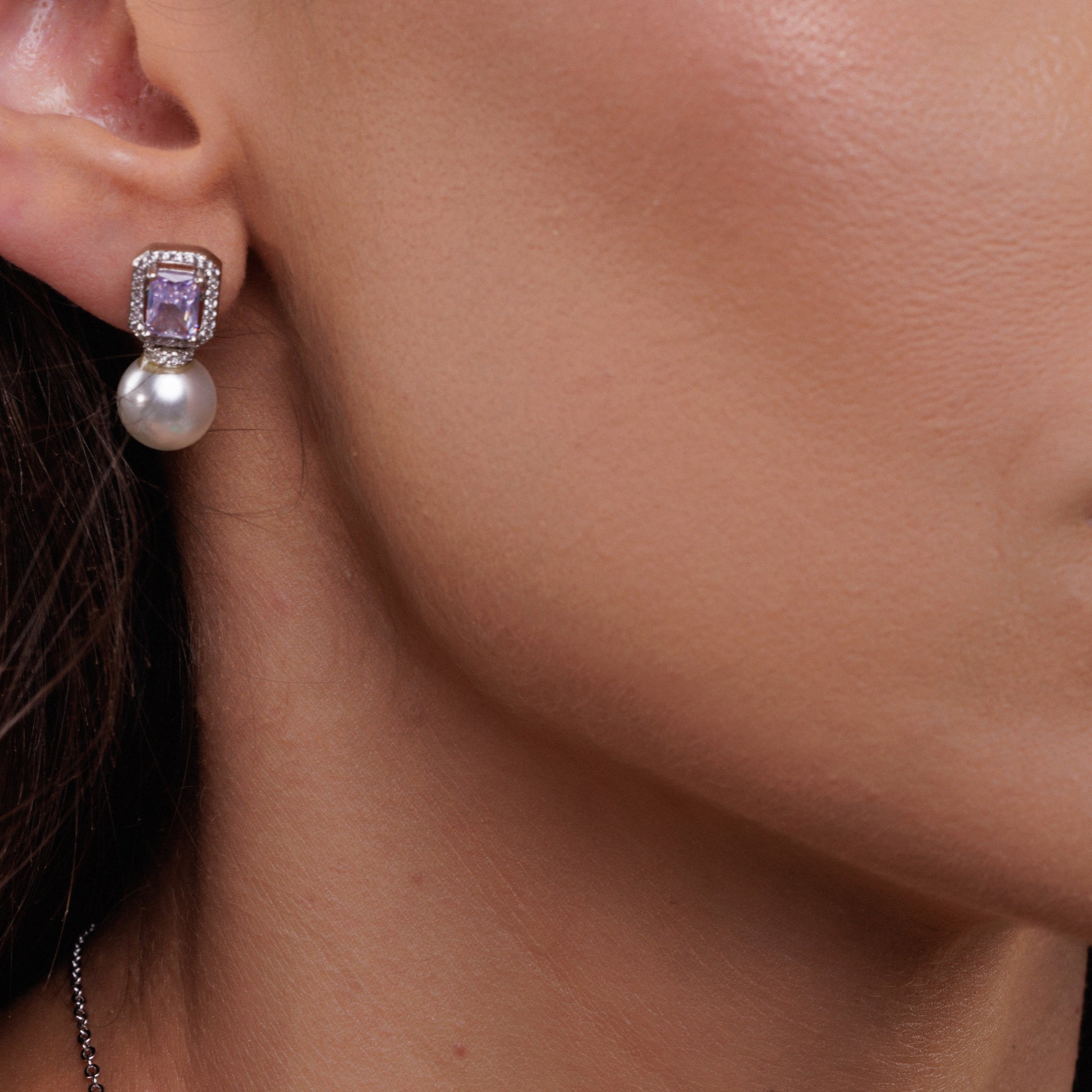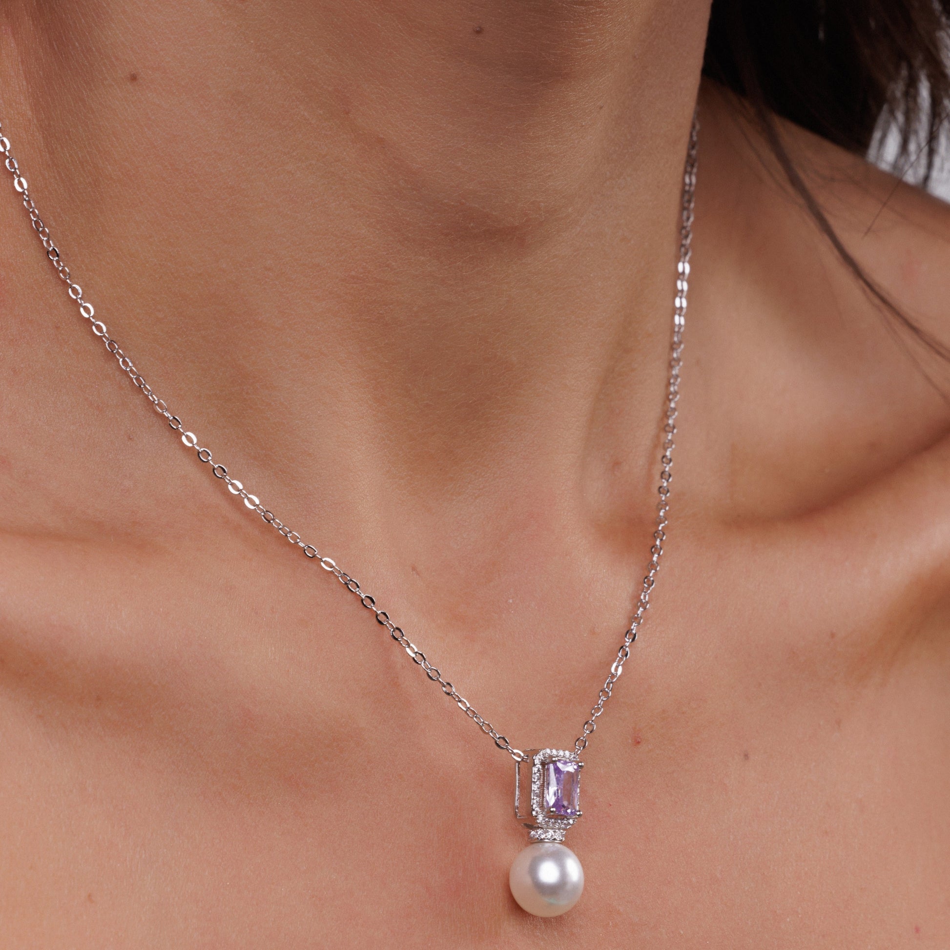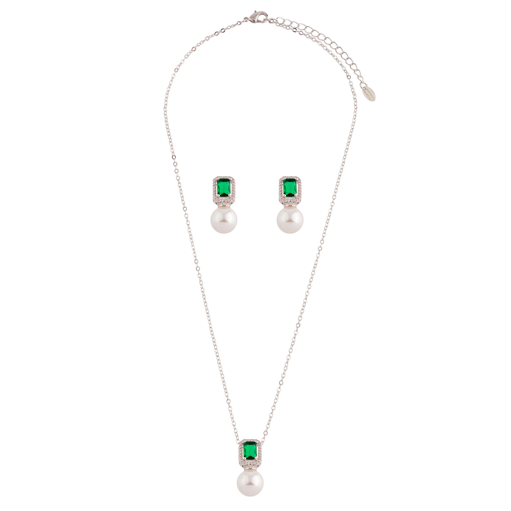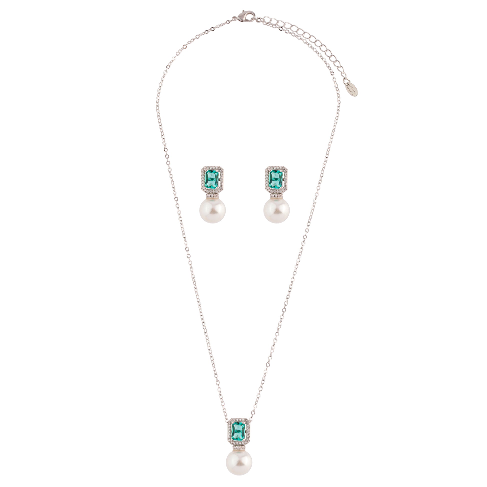 Descrição: Conjunto composto de colar e brinco na forma retangular, com zircônia cristal cravejado entorno e pedra colorida no centro. Base prateada.