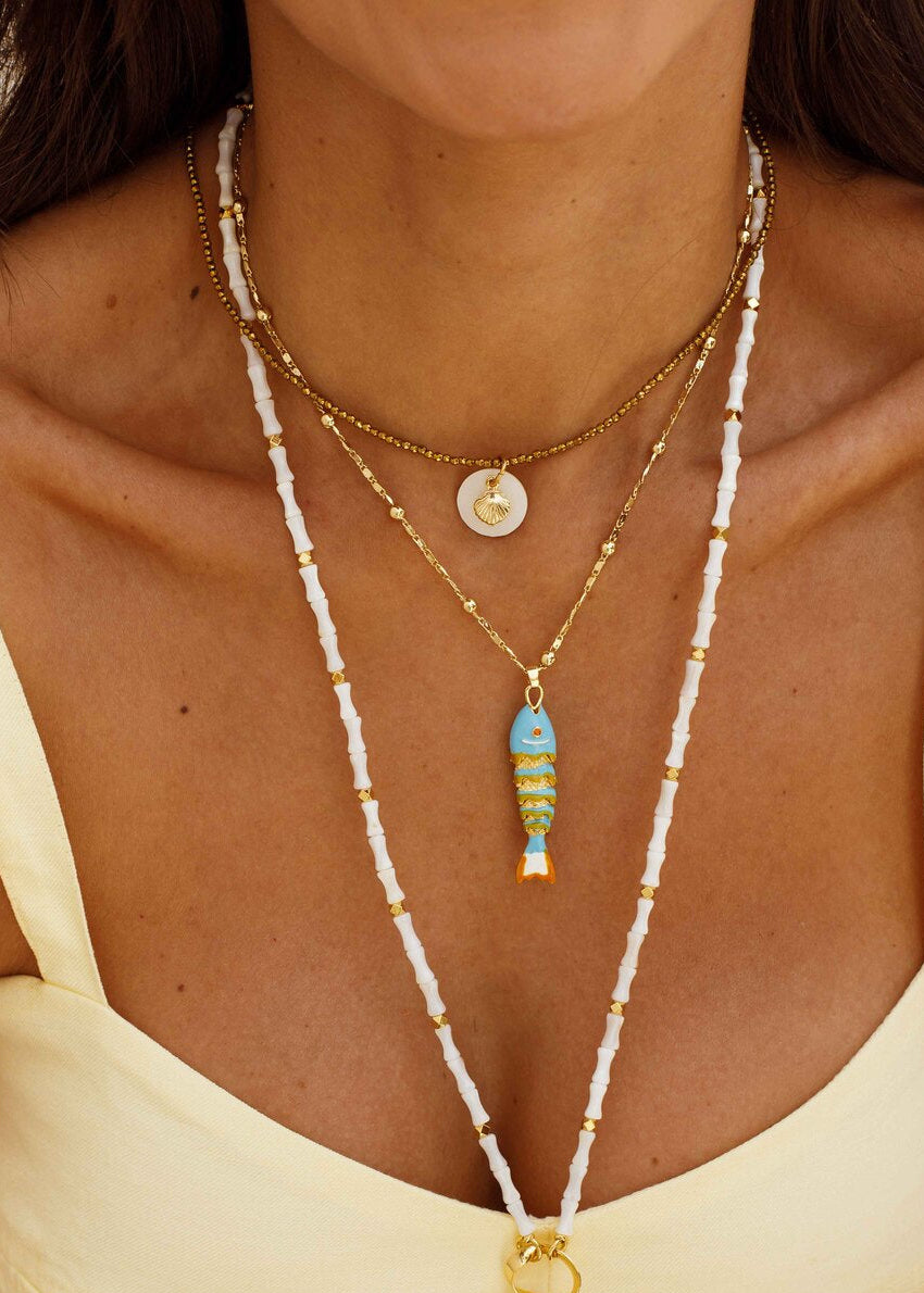 O Colar Duplo Sardinha combina duas correntes douradas delicadas e complementares. A primeira traz um pingente minimalista em formato de concha e medalhe de madre pérola, artesanal com mini cristais de hematita, enquanto a segunda destaca a sardinha azul esmaltada e corrente banhada de ouro 18k com detalhes de mini esferas na corrente, adicionando cor e charme ao look. Leve, moderno e com estética litorânea, é a peça ideal para iluminar produções de verão e criar camadas elegantes sem esforço.