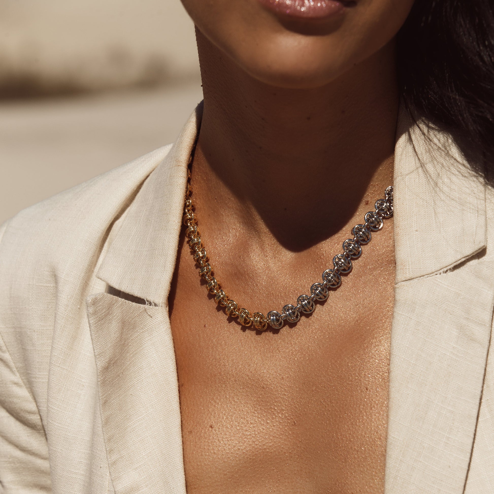 O Colar Elos Nós com Mistura de Banhos é a escolha ideal para quem busca um acessório sofisticado e moderno. Com design marcante, ele é composto por elos entrelaçados em formato de nós, mesclando os banhos dourado e prateado de forma elegante e versátil. Essa combinação cria um visual autêntico que transita facilmente entre produções clássicas e contemporâneas. Um colar imponente que valoriza o colo e traz um toque de ousadia e estilo para qualquer look.