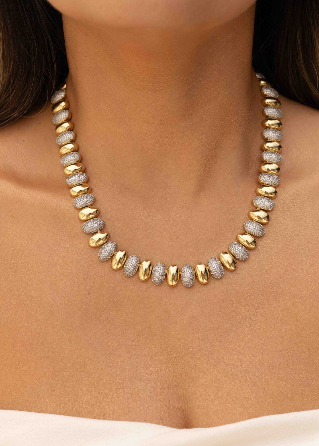 Um colar marcante que combina elos orgânicos dourados com elos cravejados, criando um visual elegante, moderno e cheio de presença. Sua textura sofisticada e brilho equilibrado fazem dele a peça perfeita para transformar qualquer produção.
