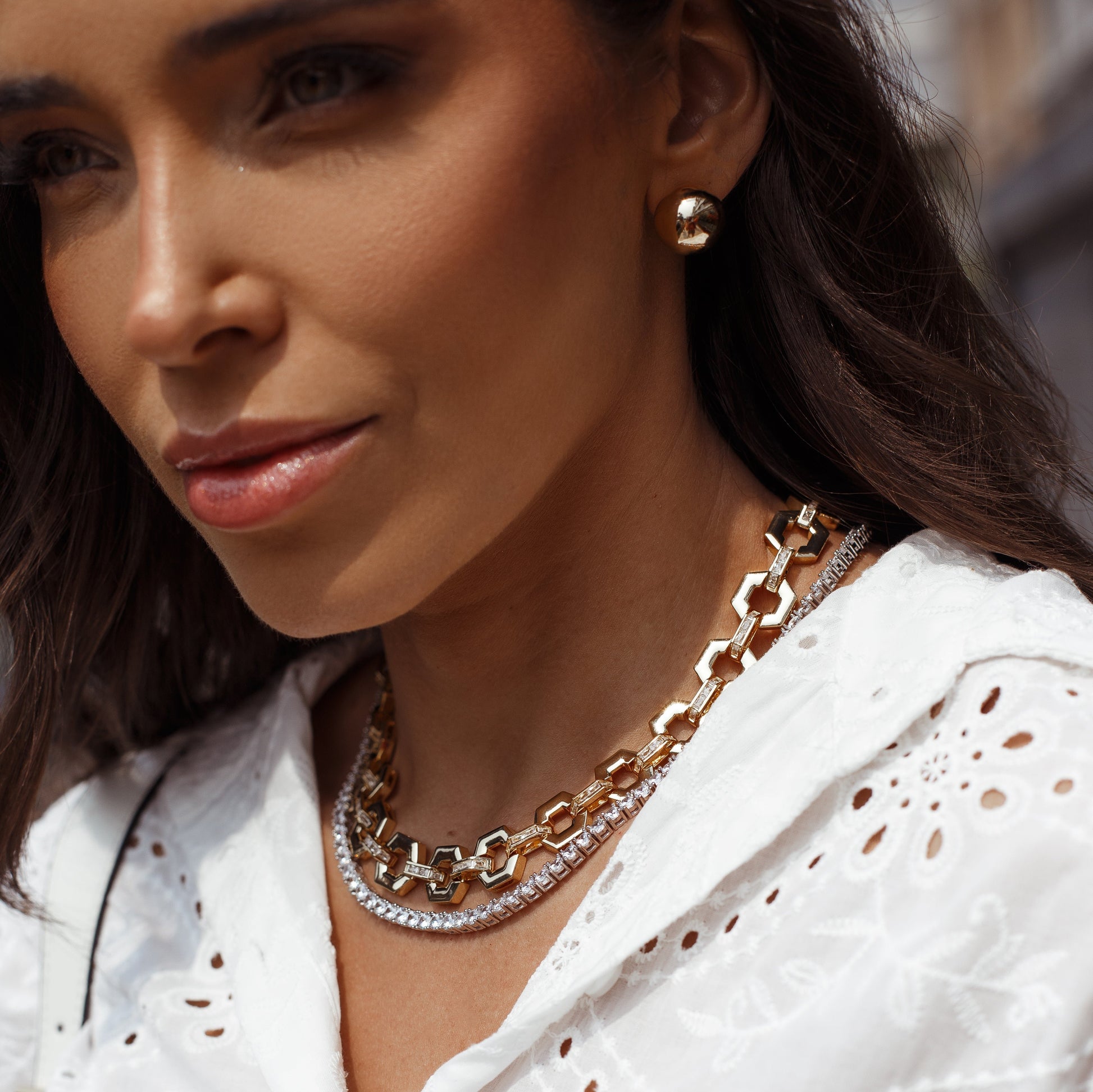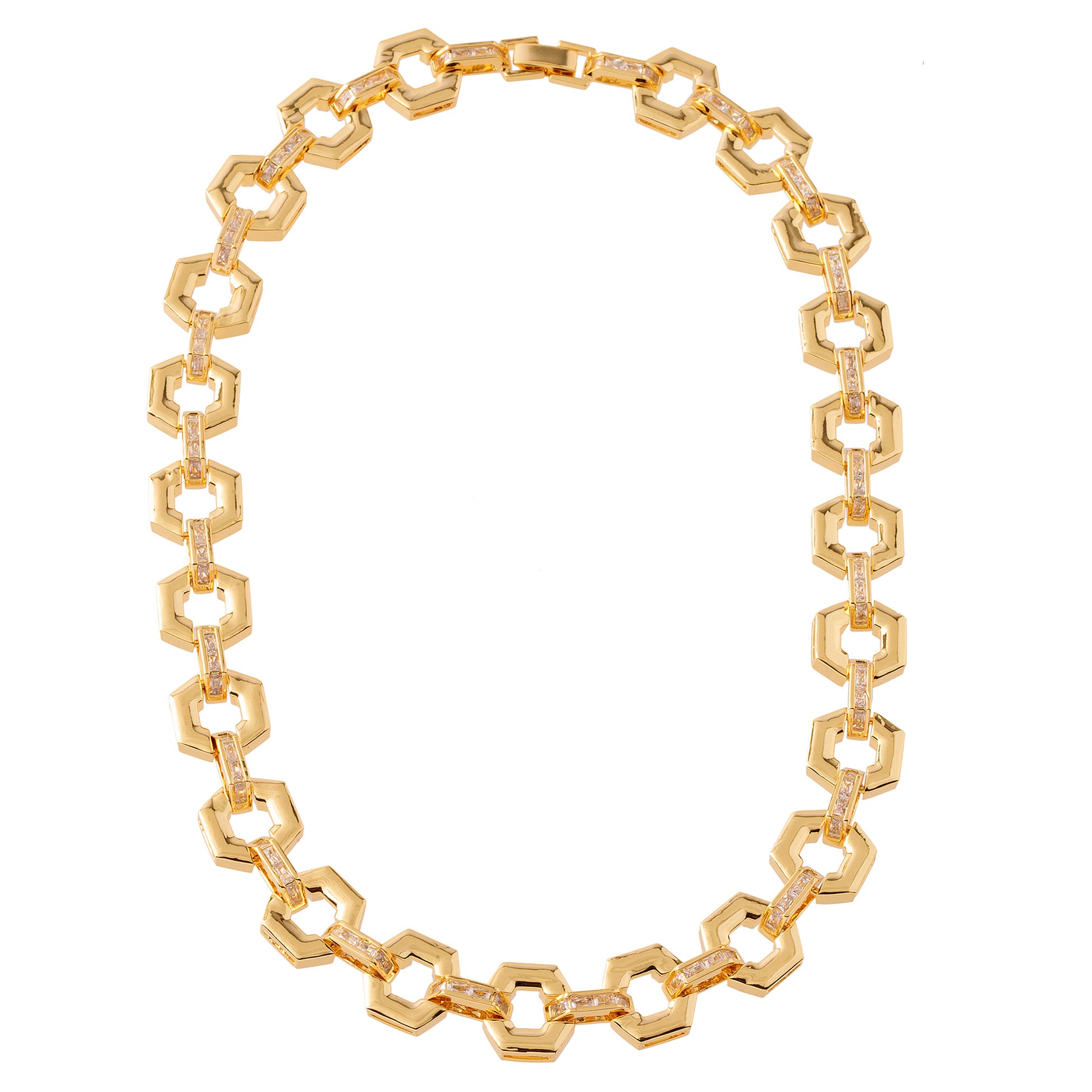 Descrição: colar de elos em formato de hexágonos com detalhes cravejados em zircônia cristal