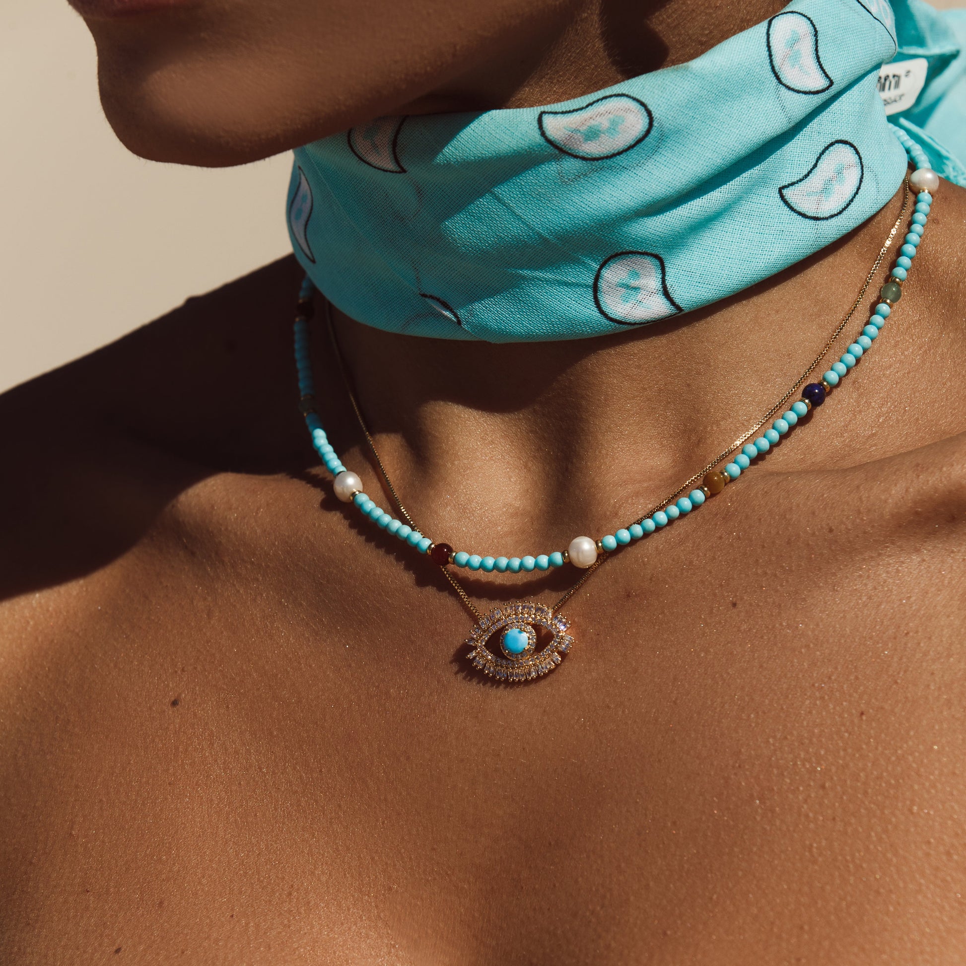 O Colar Olho Grego Cravejado Turquesa é a escolha perfeita para quem busca um acessório cheio de estilo e significado. O pingente em formato de olho grego, símbolo de proteção e boas energias, é todo cravejado com micro zircônias e possui detalhe central em turquesa que traz ainda mais destaque à peça. Moderno e sofisticado, ele pode ser usado sozinho como ponto de luz ou combinado com outros colares para um visual marcante. Ideal para complementar looks casuais ou elegantes, é aquele acessório que une beleza e simbologia em perfeita harmonia.