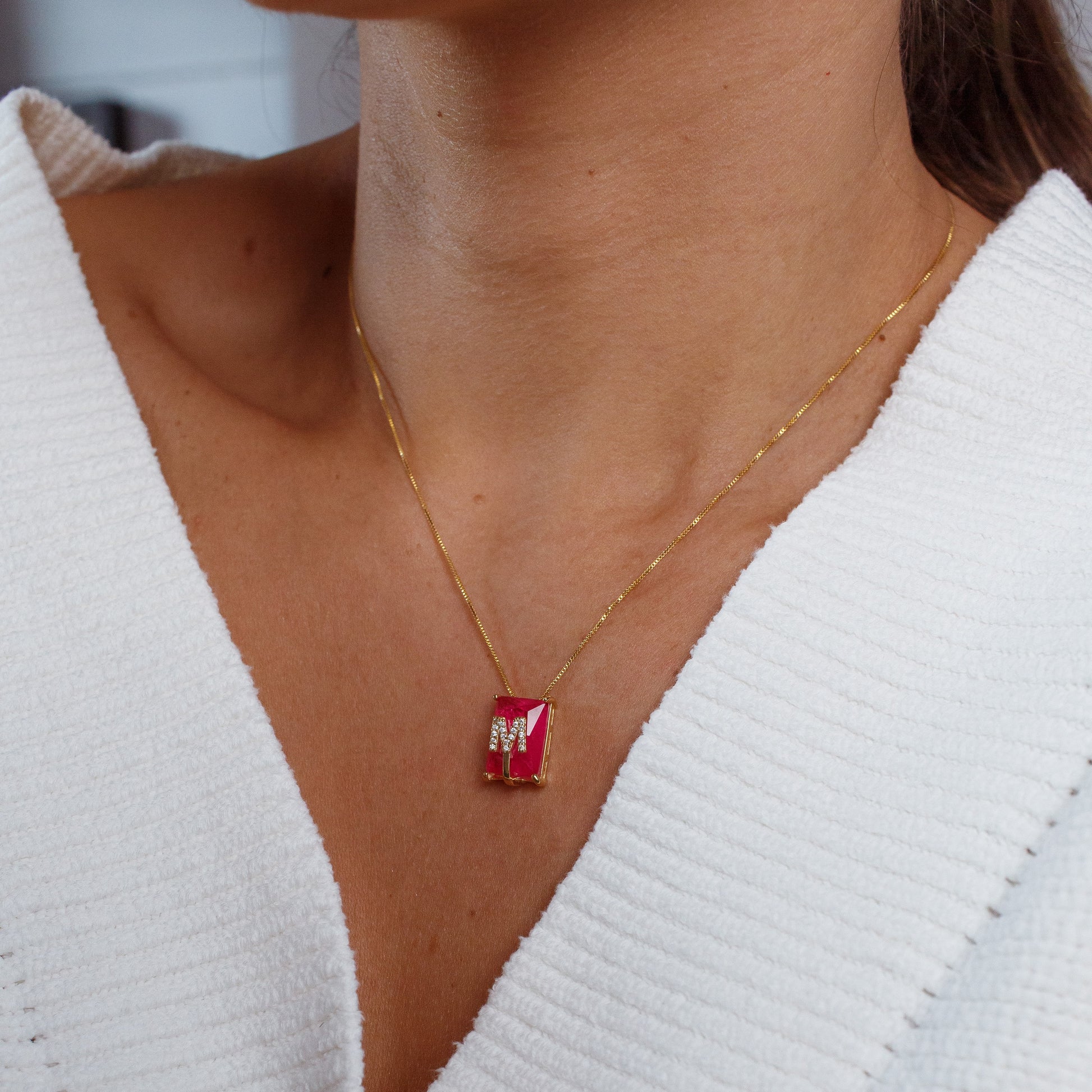 Descrição: Colar corrente lisa com pingente de pedra rosa e inicial cravejada em zircônia cristal.