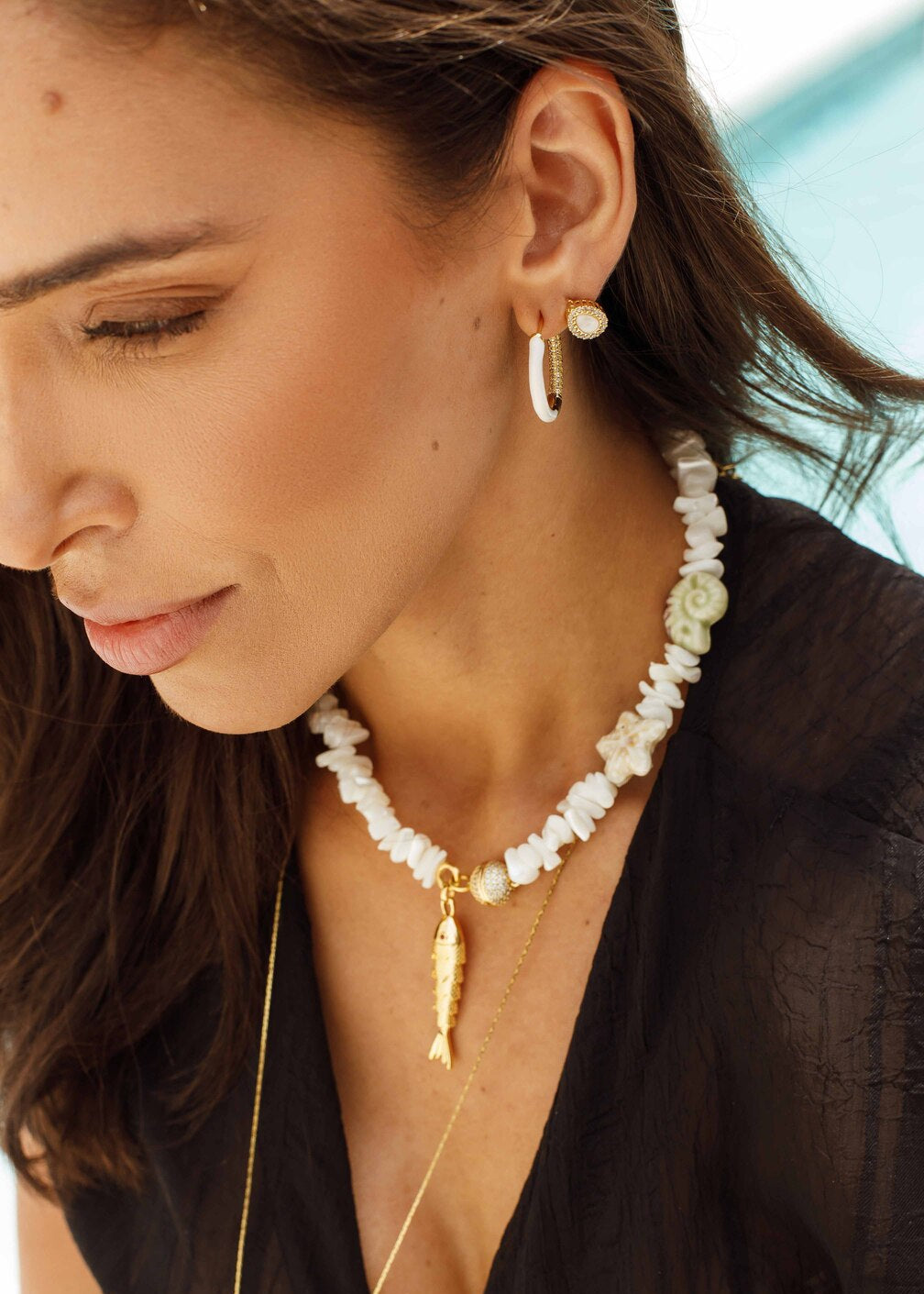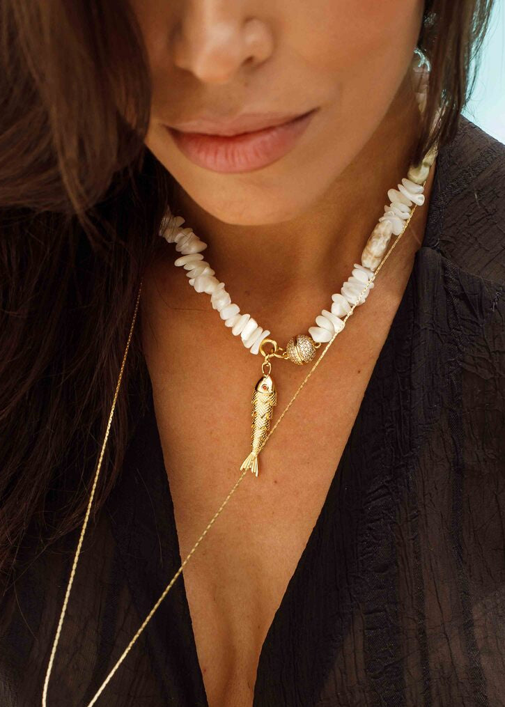As pedras naturais em tons claros evocam a textura da areia e das conchas, enquanto o pingente de peixe surge como amuleto de proteção, movimento e conexão com o mar.