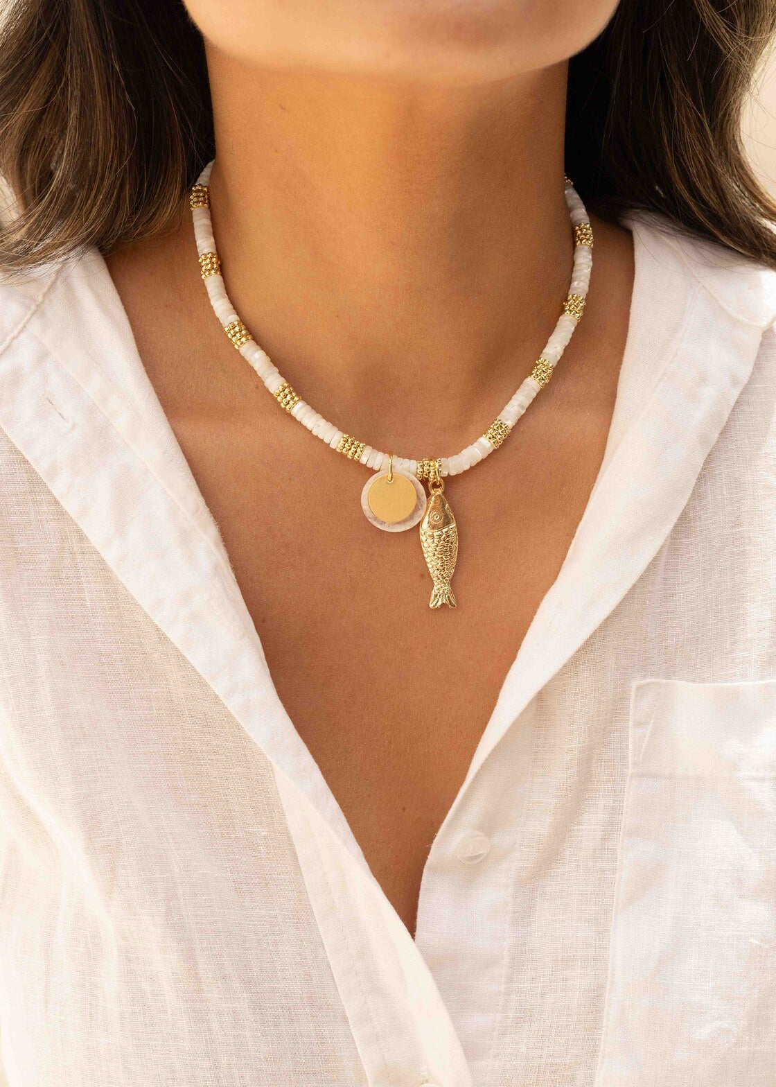 O Colar Discos Oceano é composto por discos de madrepérola natural intercalados com detalhes dourados que iluminam o colo com elegância. O pingente de sardinha traz um toque litorâneo moderno, criando uma peça leve, charmosa e com personalidade. Perfeito para compor looks de verão com frescor e sofisticação.