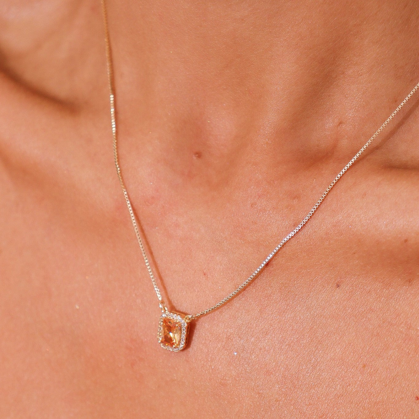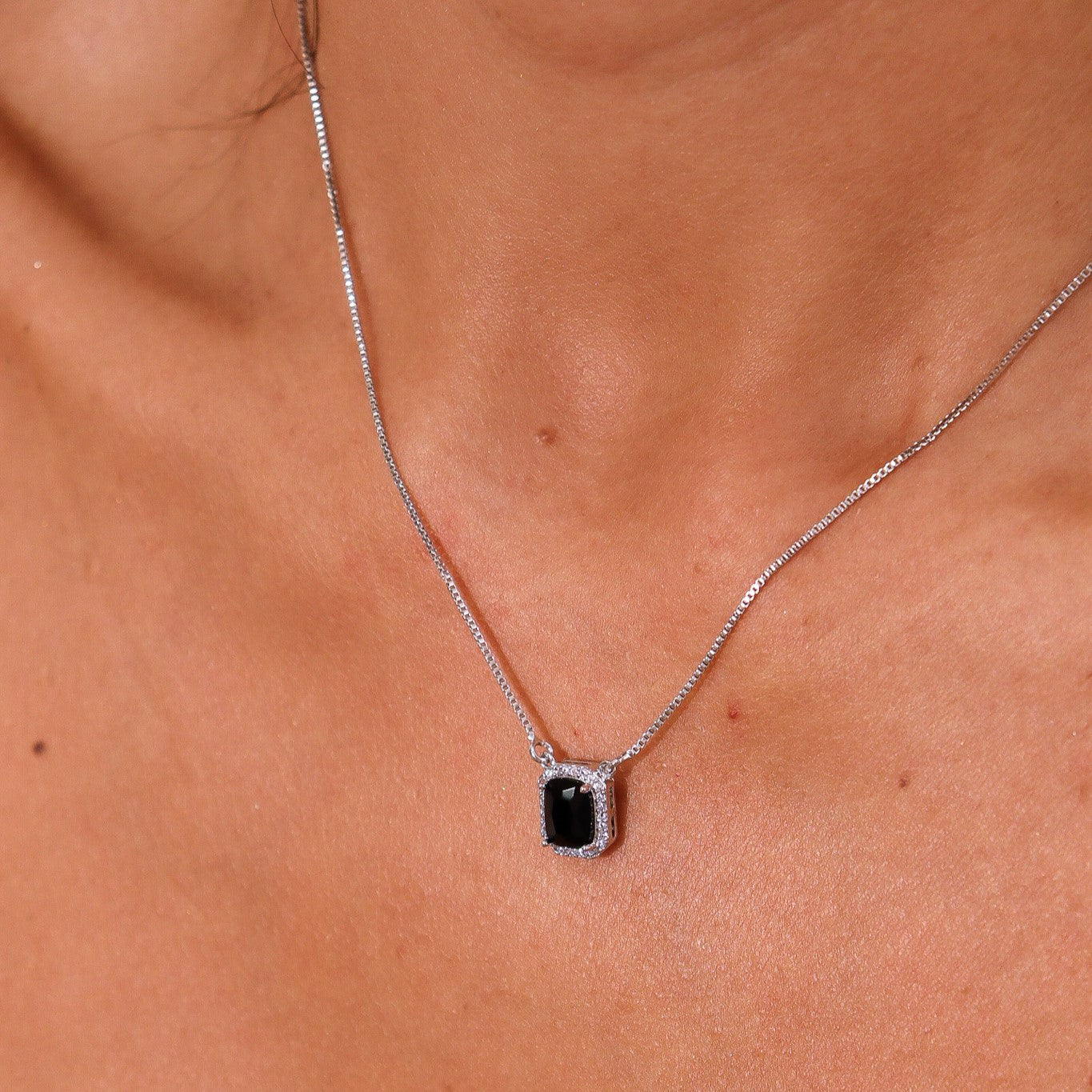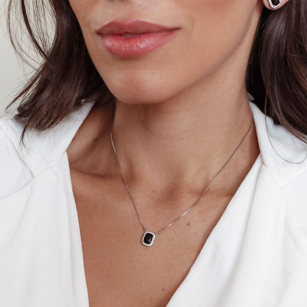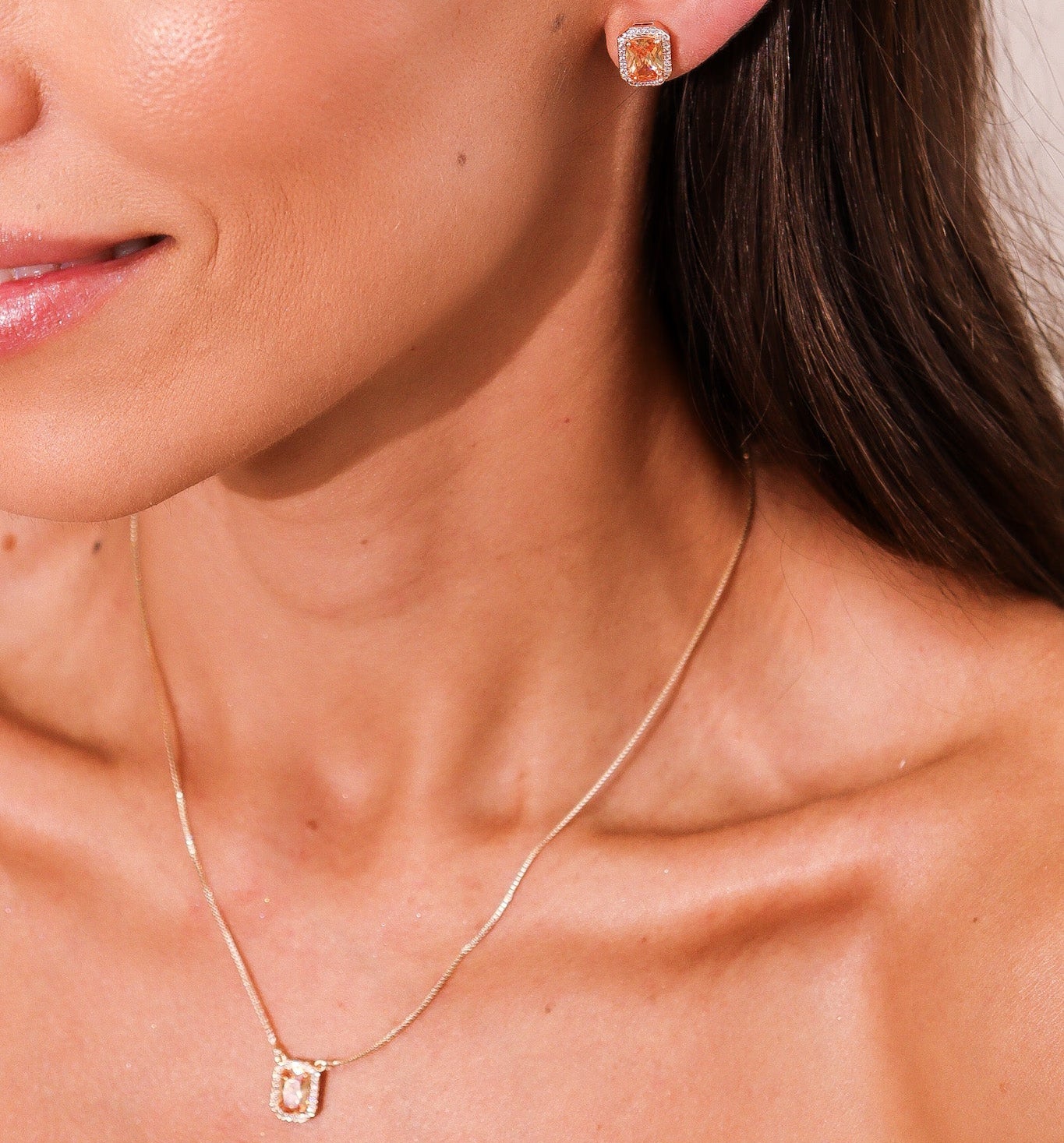 Descrição: Conjunto composto de colar e brinco em formato retangular com pedra centro cristal/morganita/ônix e entorno cravejado em zircônia cristal