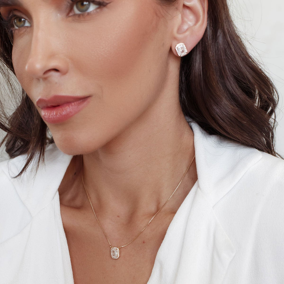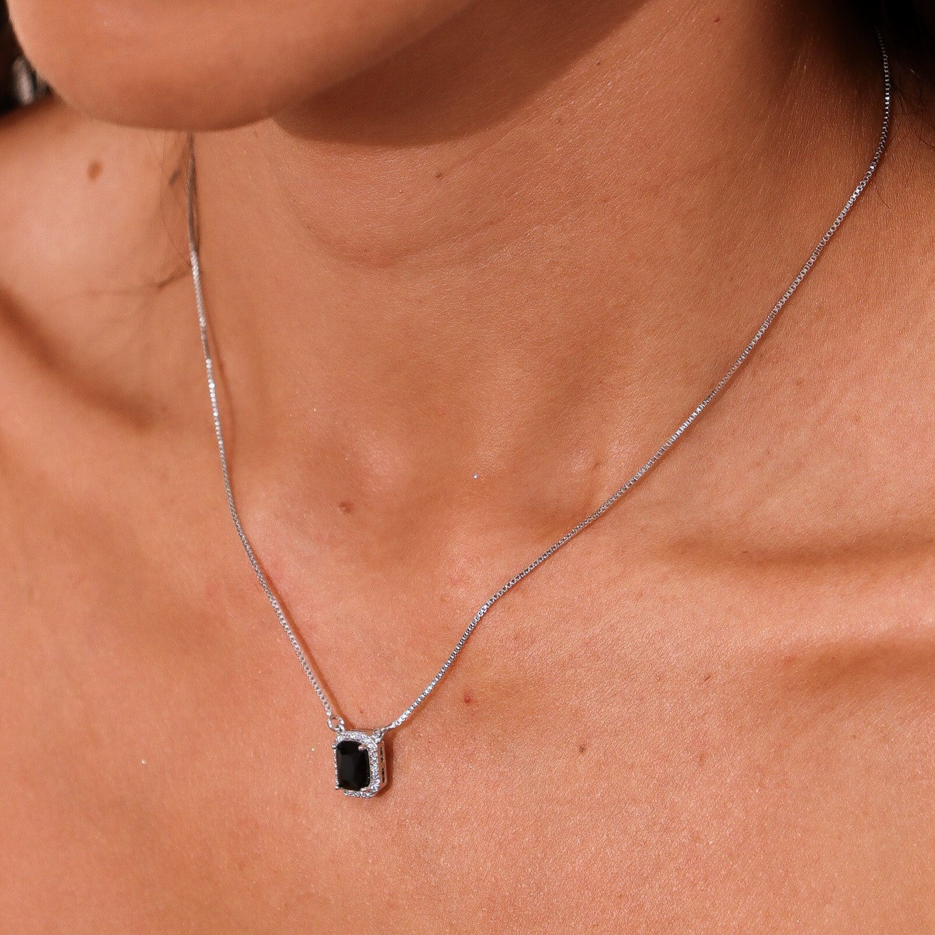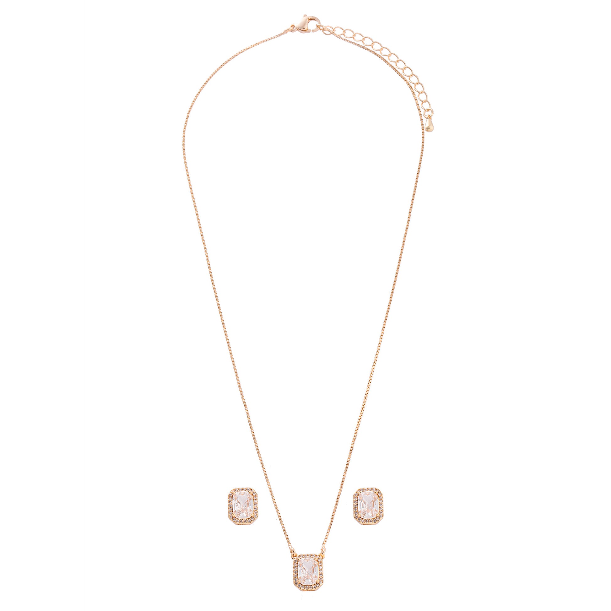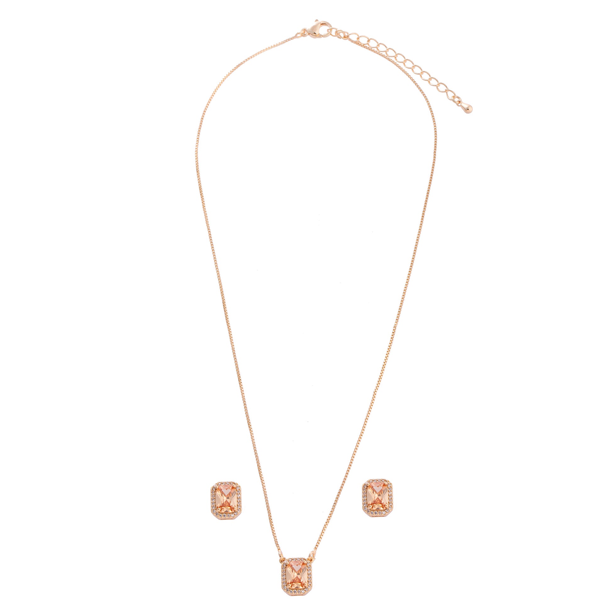 Descrição: Conjunto composto de colar e brinco em formato retangular com pedra centro cristal/morganita/ônix e entorno cravejado em zircônia cristal