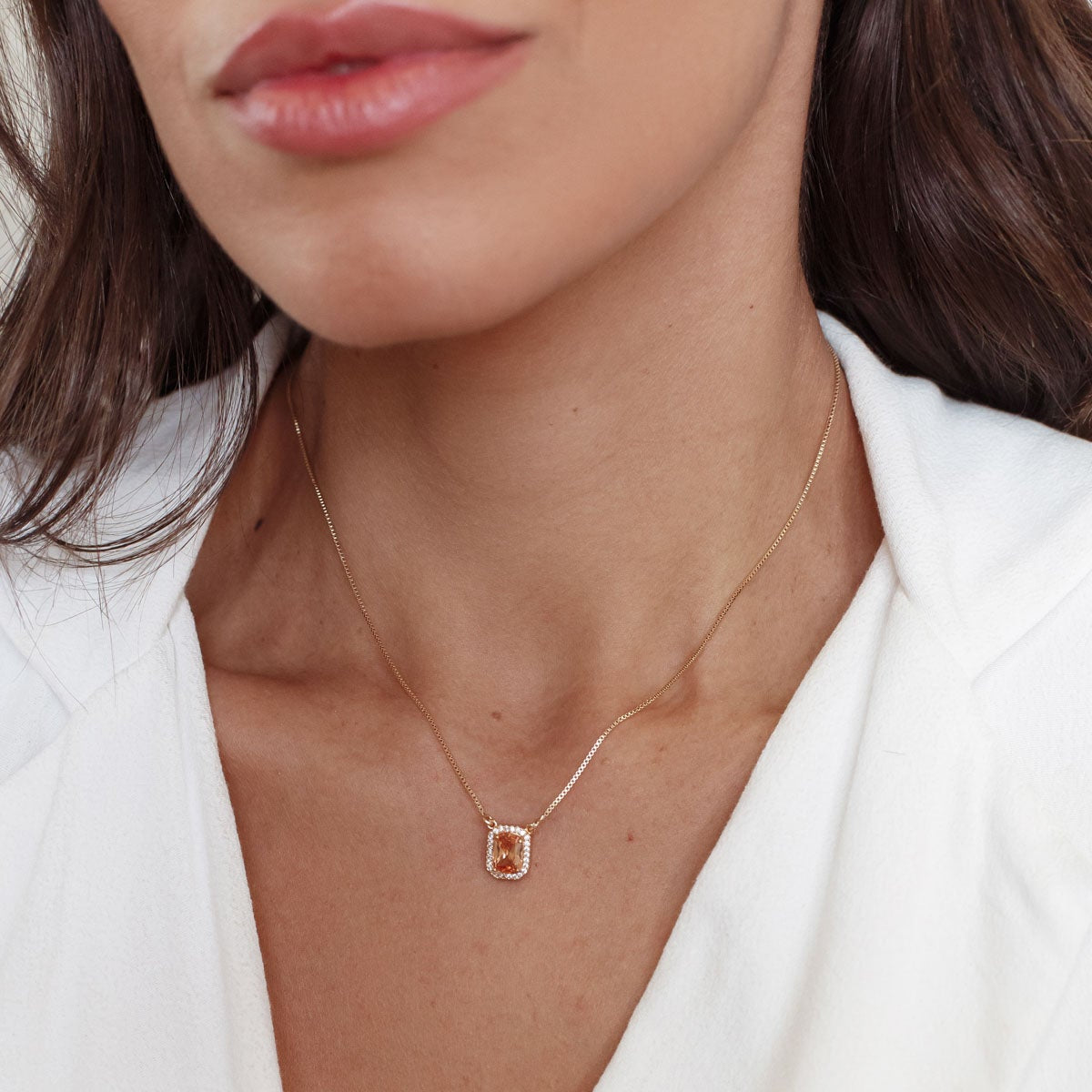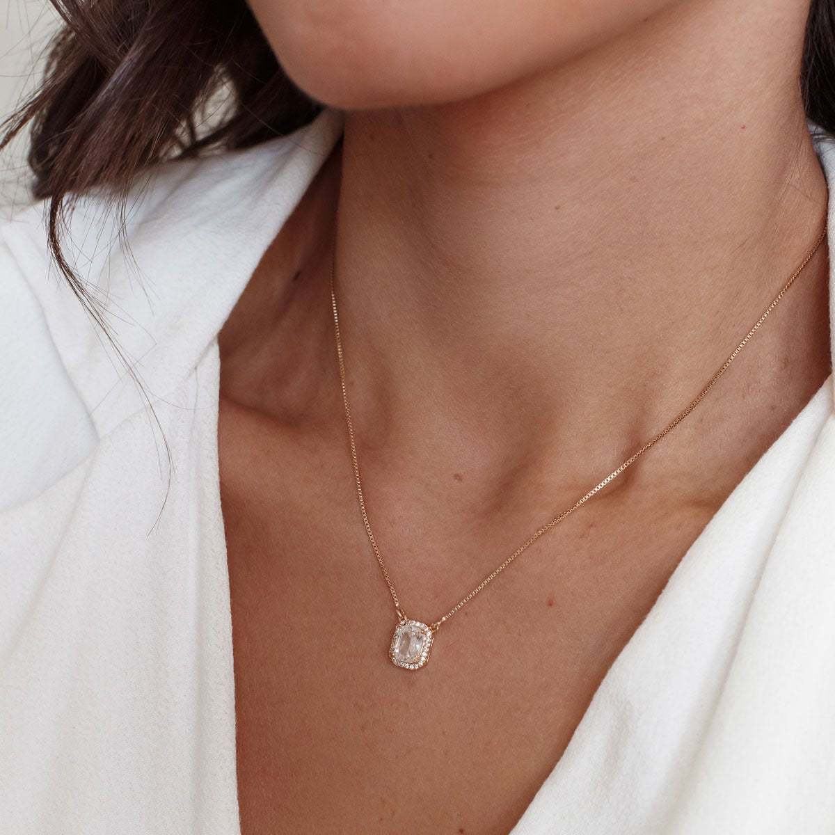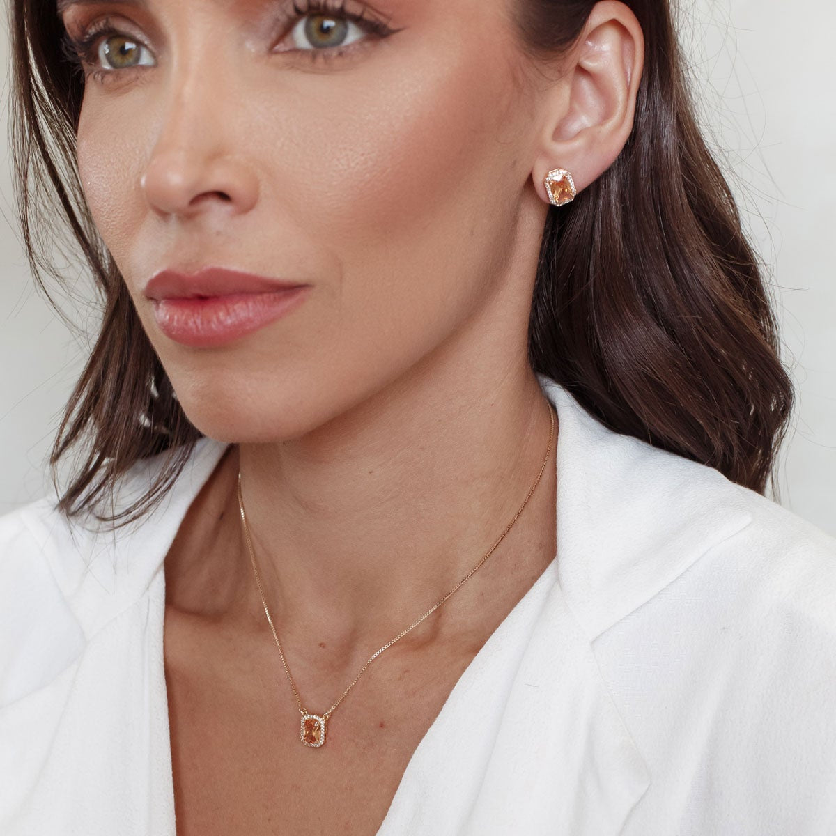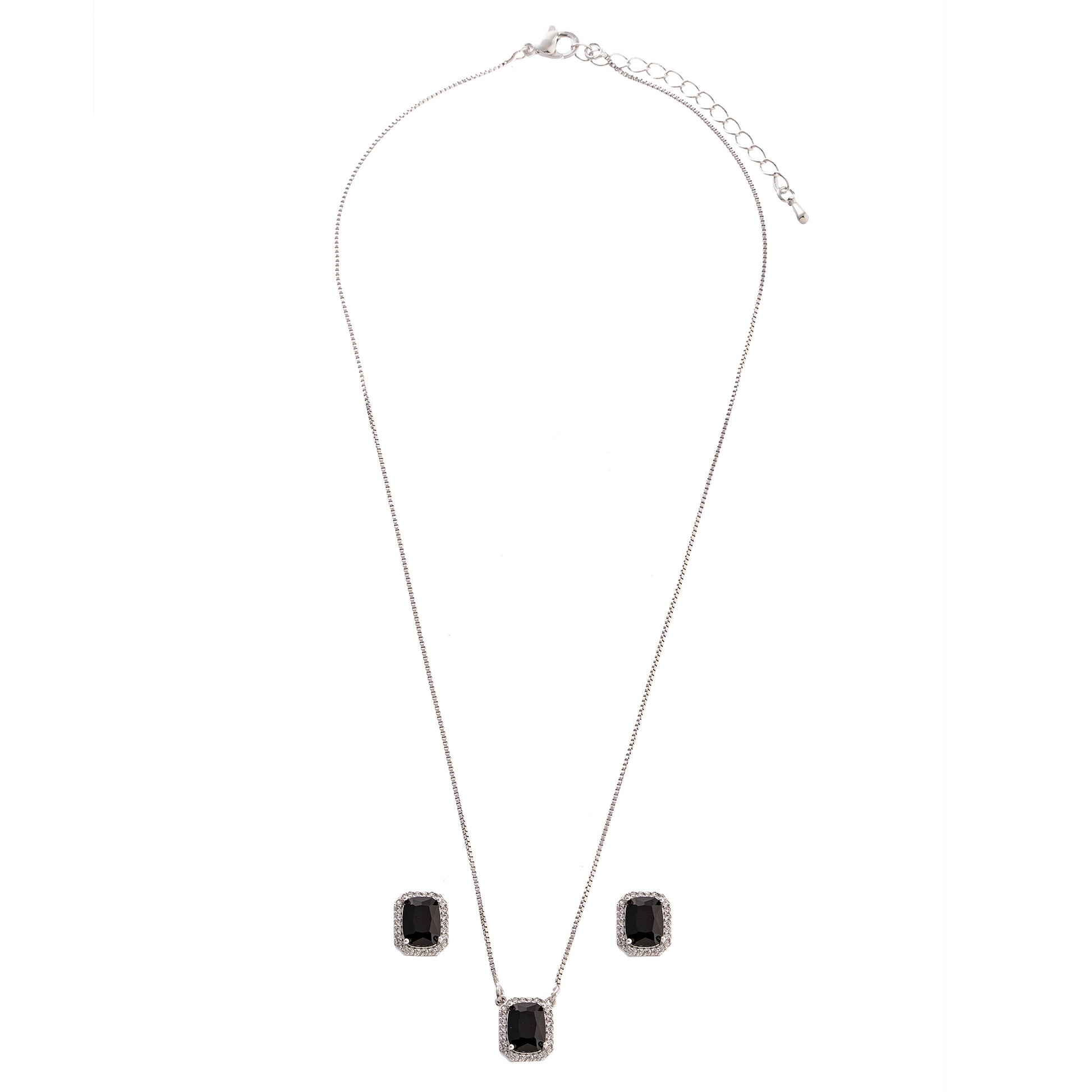 Descrição: Conjunto composto de colar e brinco em formato retangular com pedra centro cristal/morganita/ônix e entorno cravejado em zircônia cristal