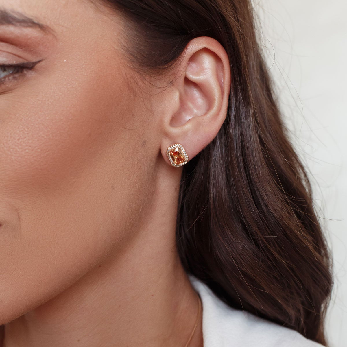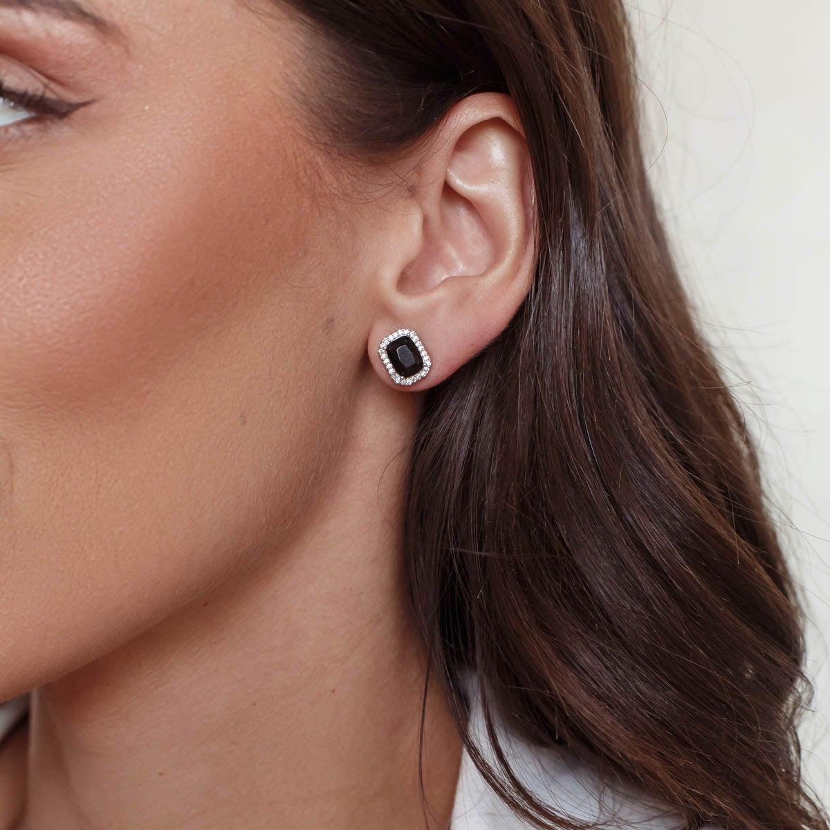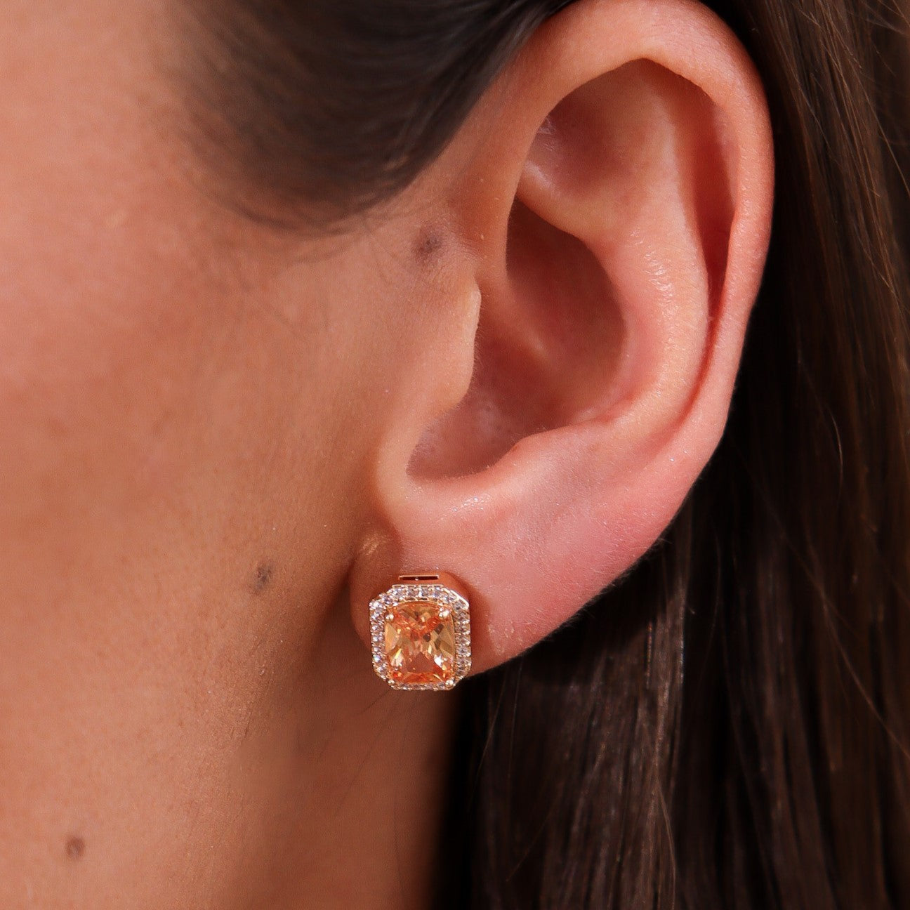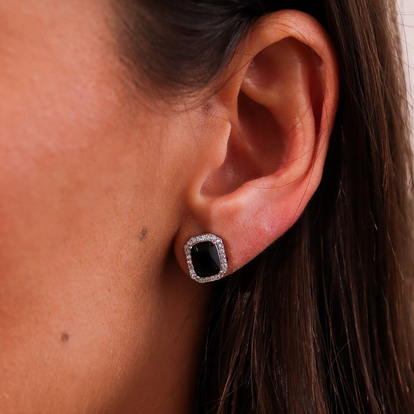 Descrição: Conjunto composto de colar e brinco em formato retangular com pedra centro cristal/morganita/ônix e entorno cravejado em zircônia cristal