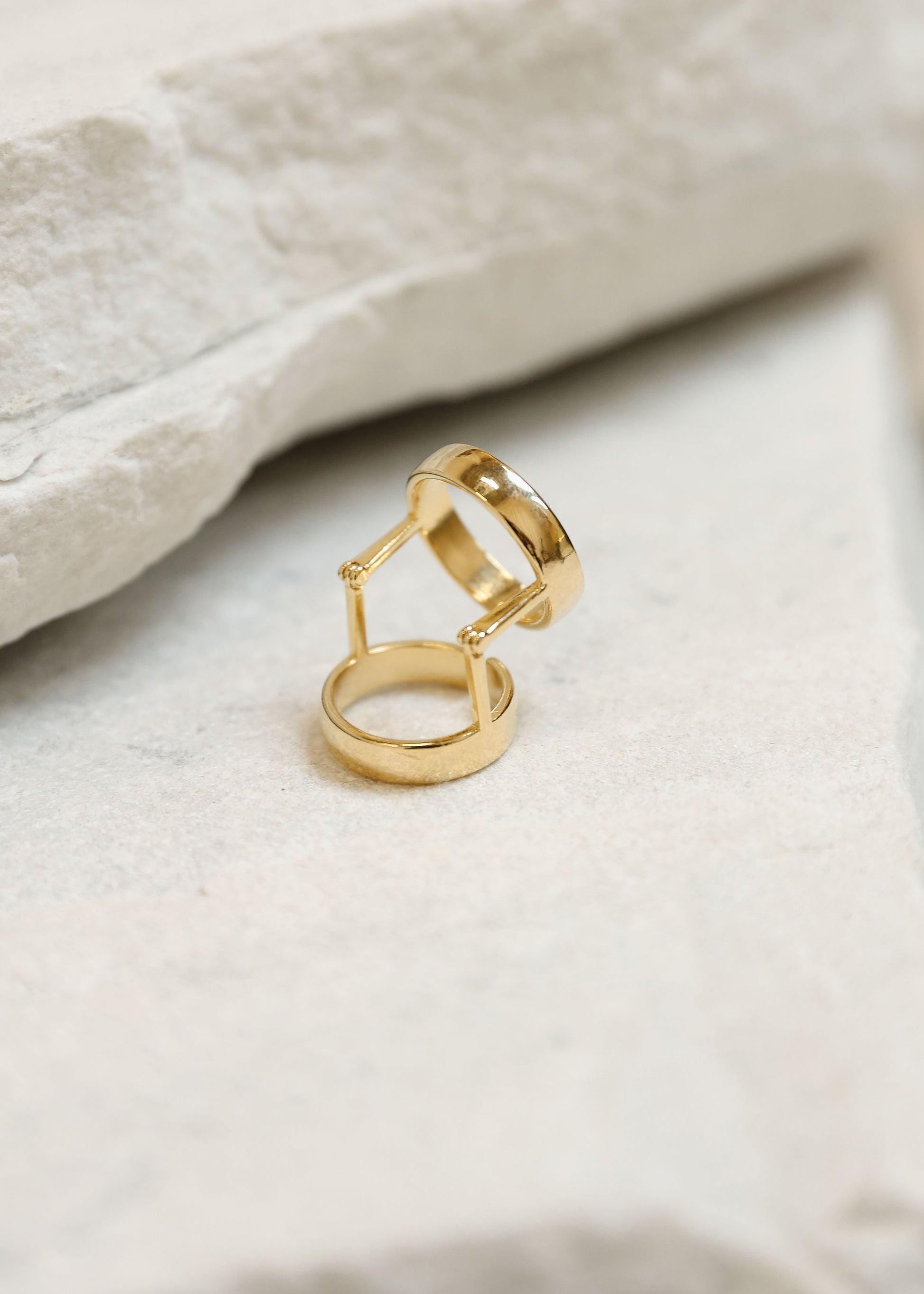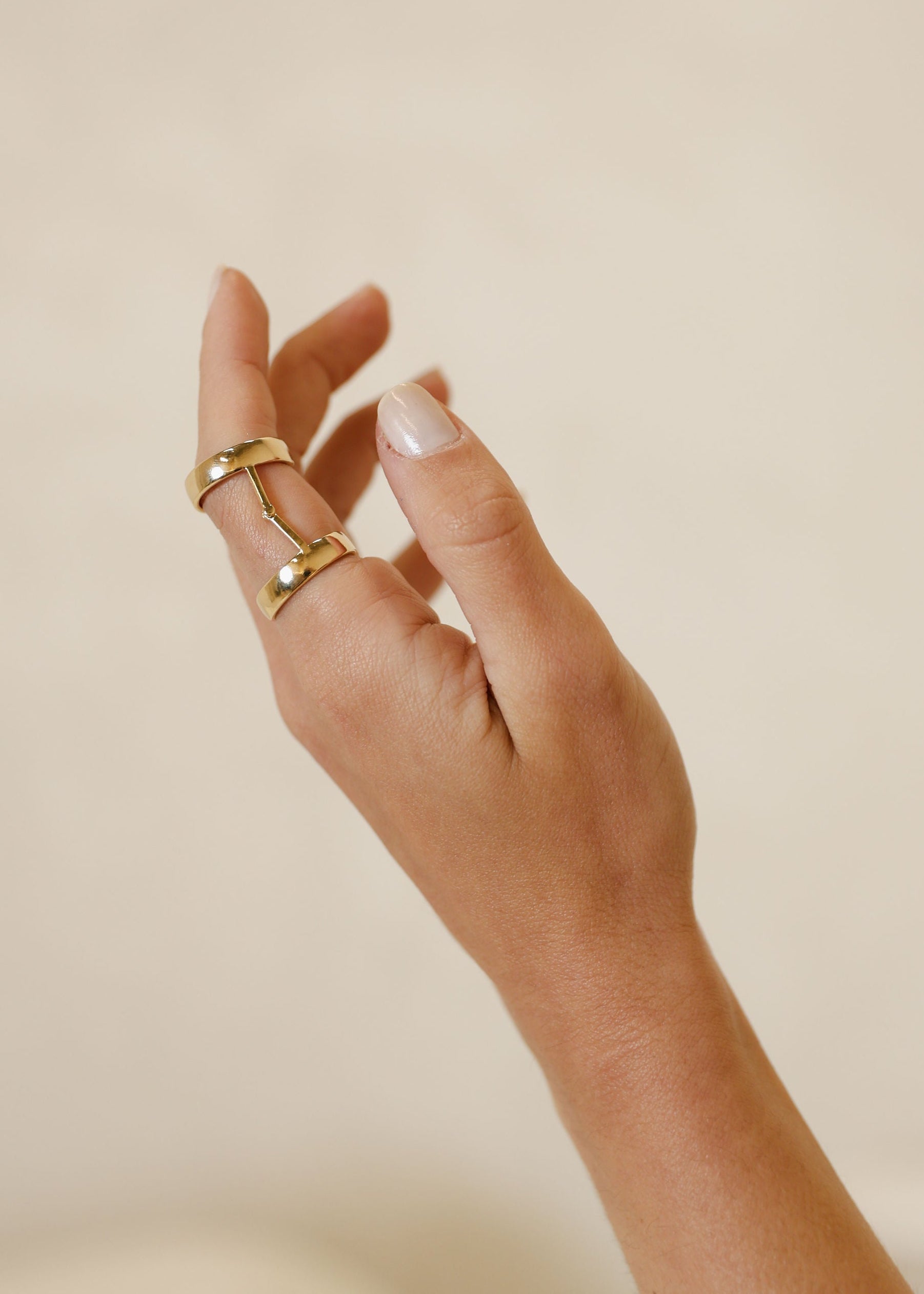 O Anel Estruturado Dourado Regulável é uma peça moderna, arquitetônica e super estilosa. Seu design possui duas bases conectadas por hastes metálicas, criando uma silhueta geométrica que foge do óbvio e traz um toque de originalidade ao look.
