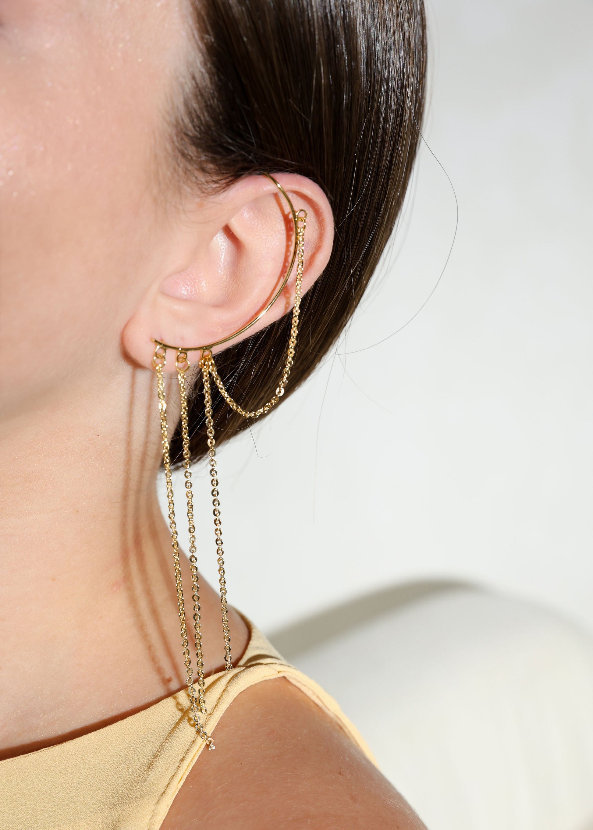 O ear cuff, usado em apenas um furo, possui 15 cm de correntes douradas que criam um caimento elegante e fluido.