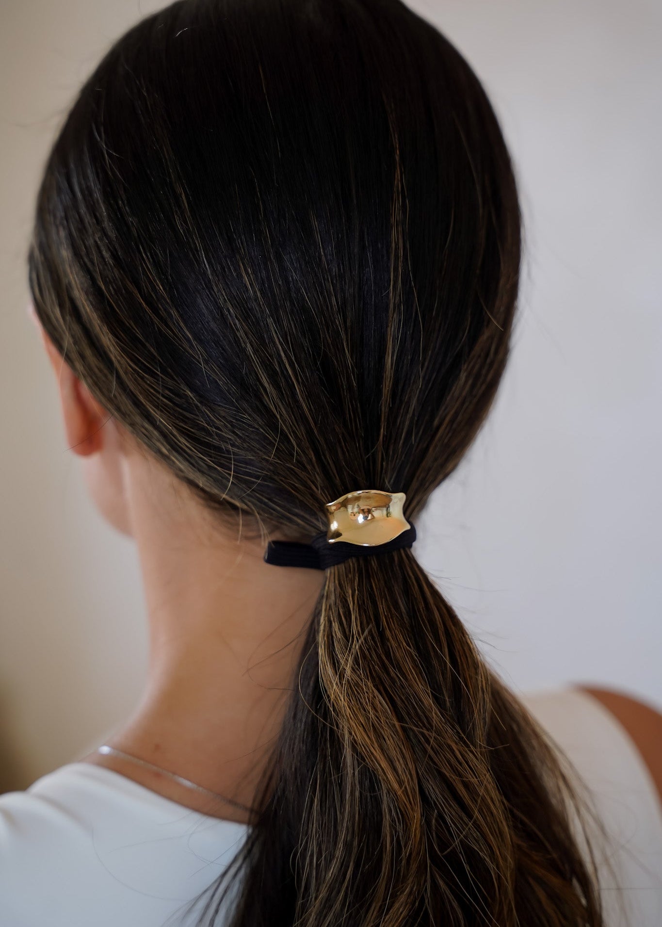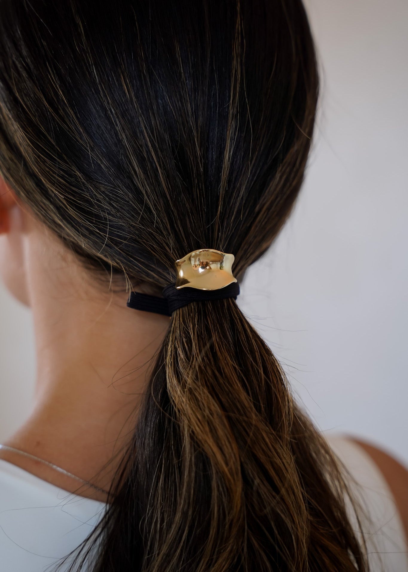 O metal dourado cria um ponto de luz sofisticado no cabelo, elevando produções básicas com um detalhe moderno e refinado.