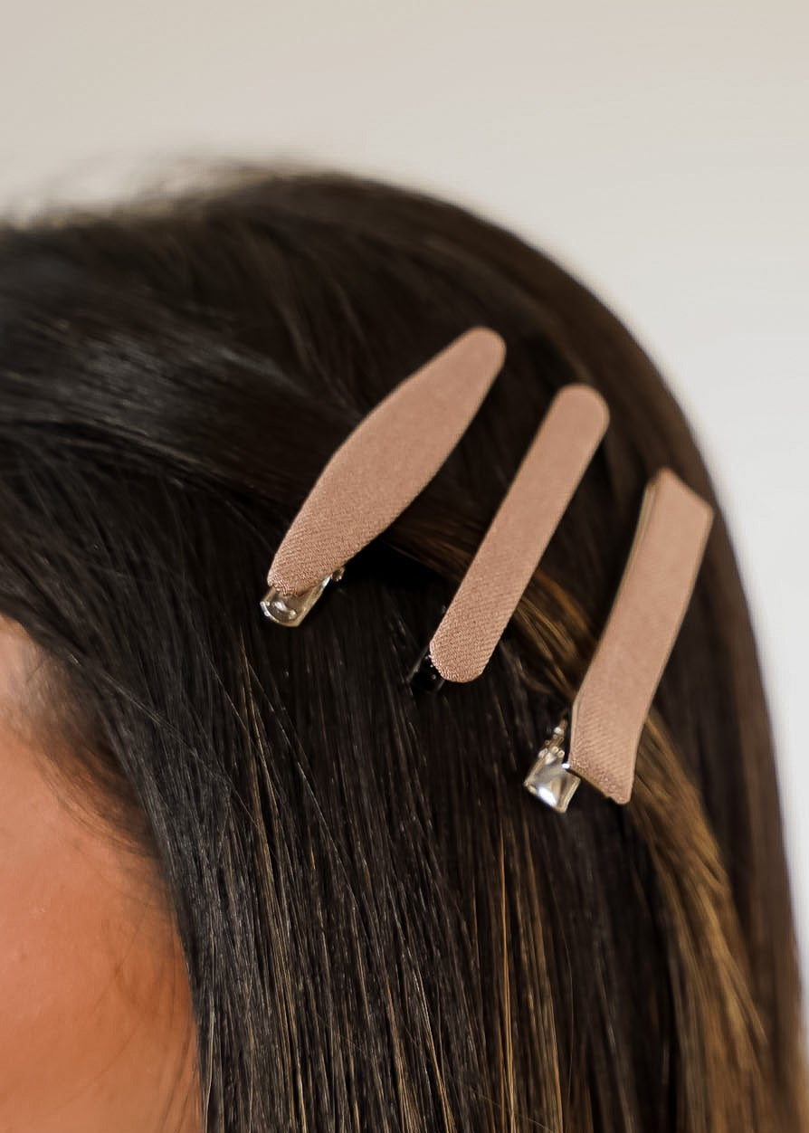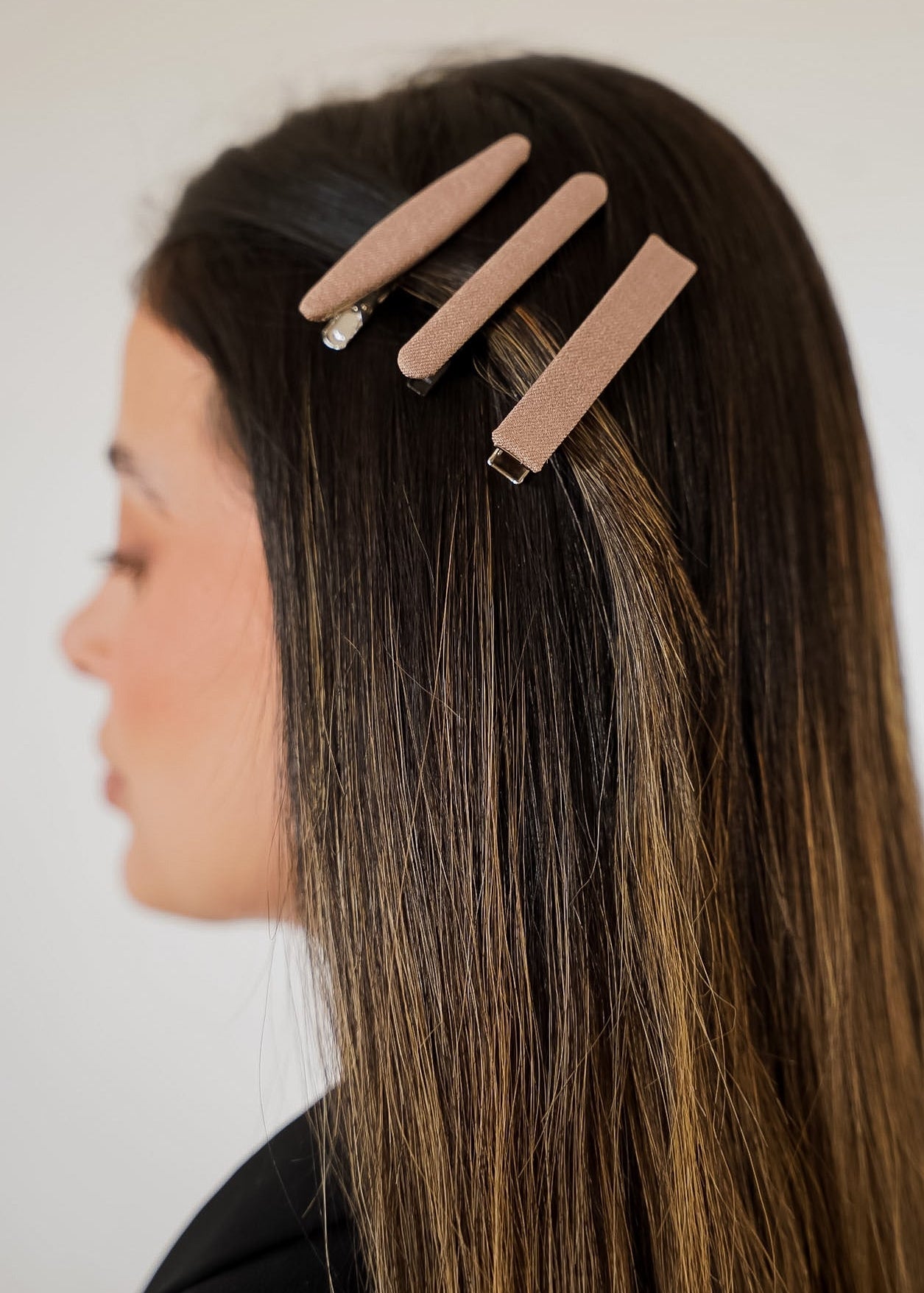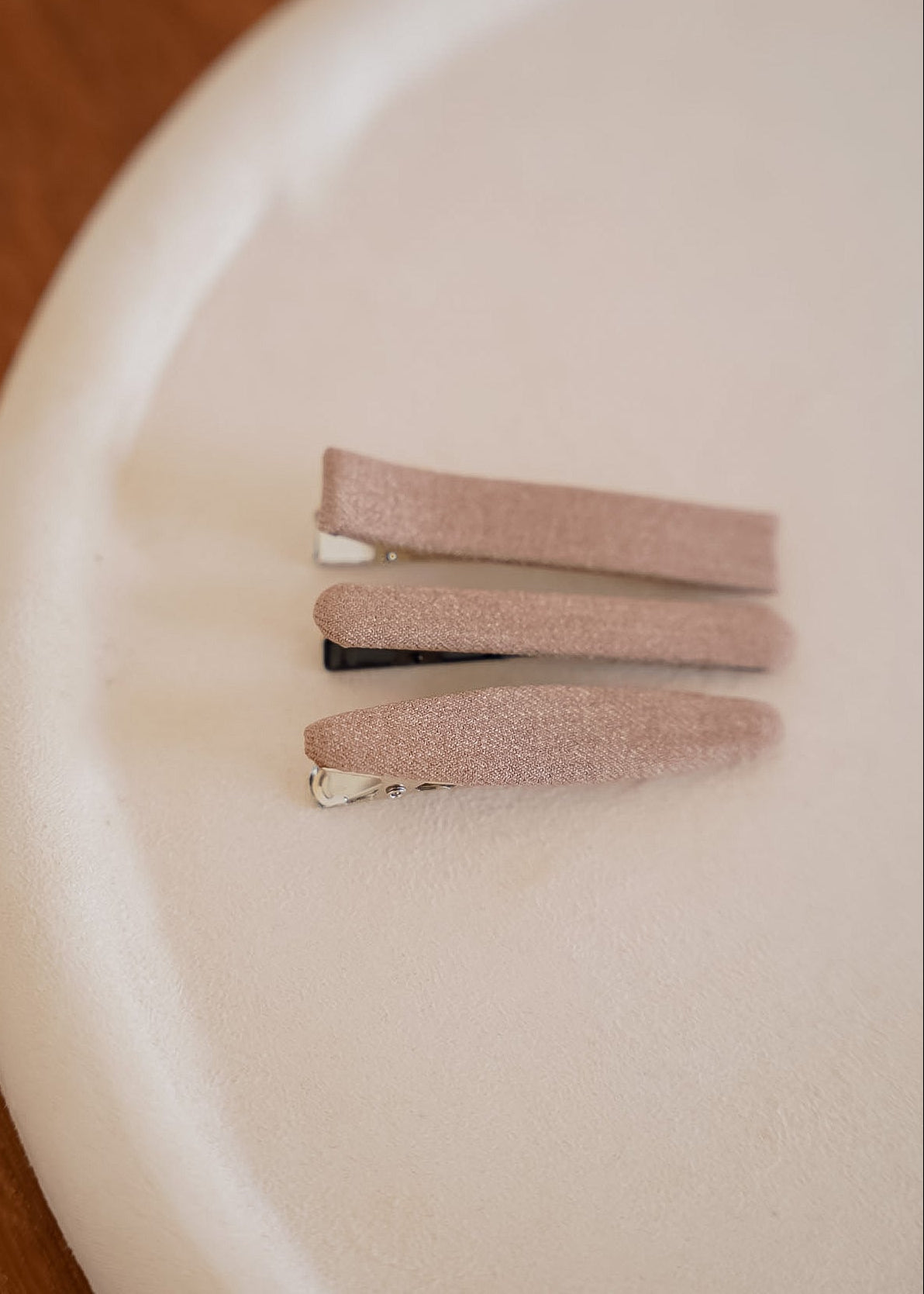 Conjunto composto por três presilhas alongadas revestidas em tecido bege com textura suave e acabamento fosco. A proposta permite uso individual ou combinado, criando diferentes composições no penteado.