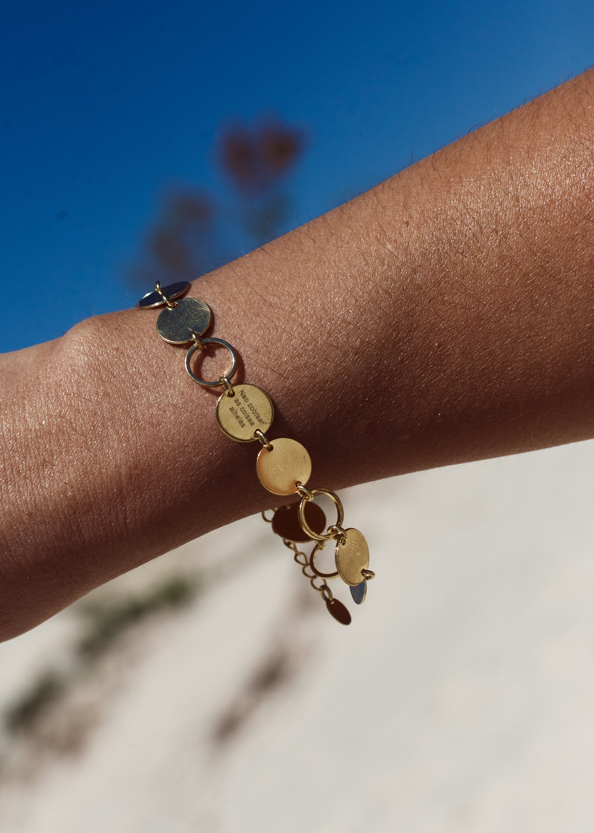 A Pulseira 7 Mandamentos é uma peça cheia de significado e estilo. Com sete plaquinhas redondas em banho dourado, cada uma simboliza um mandamento, representando proteção, fé e boas energias no dia a dia.