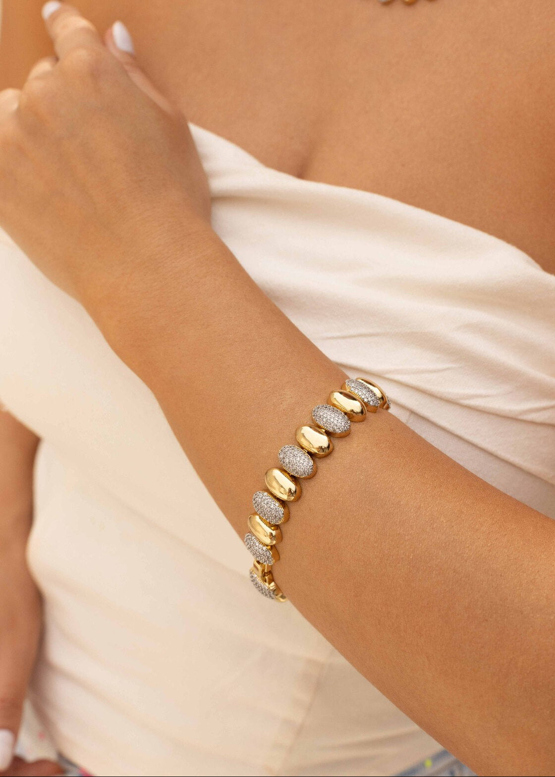 Uma pulseira sofisticada que combina elos orgânicos dourados com elos cravejados, criando um brilho moderno e atemporal. O design imponente transforma qualquer look, seja para o dia ou para a noite.