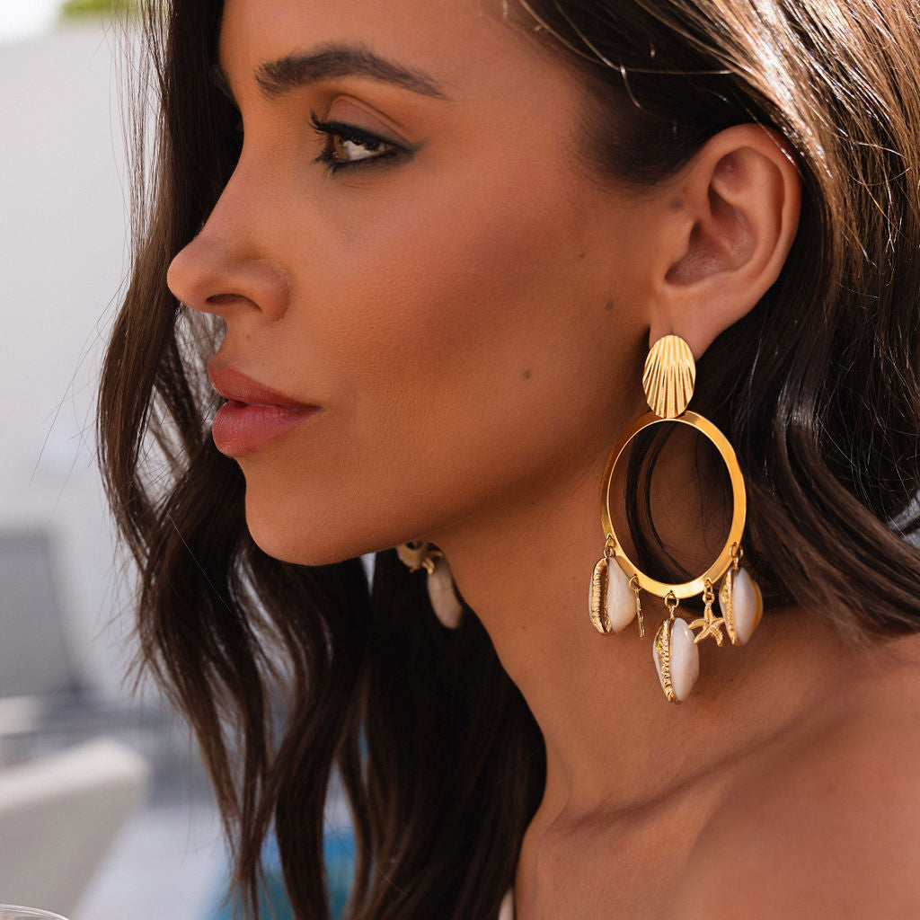Descrição: Brinco frontal com pingentes de búzios e estrela do mar