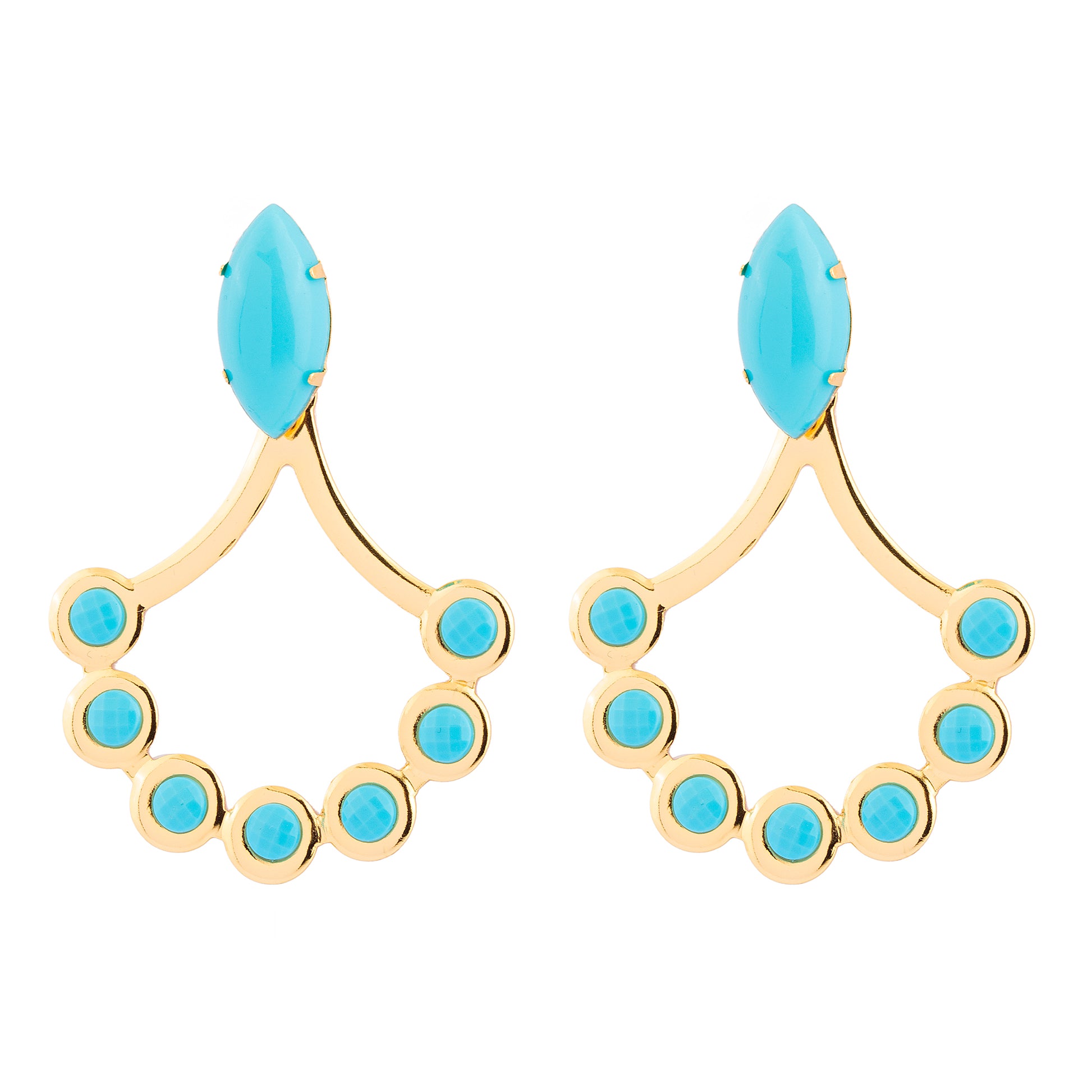Descrição: Brinco com gota alongada em pedra turquesa, e peça lisa leque com ovais em mesmo tom