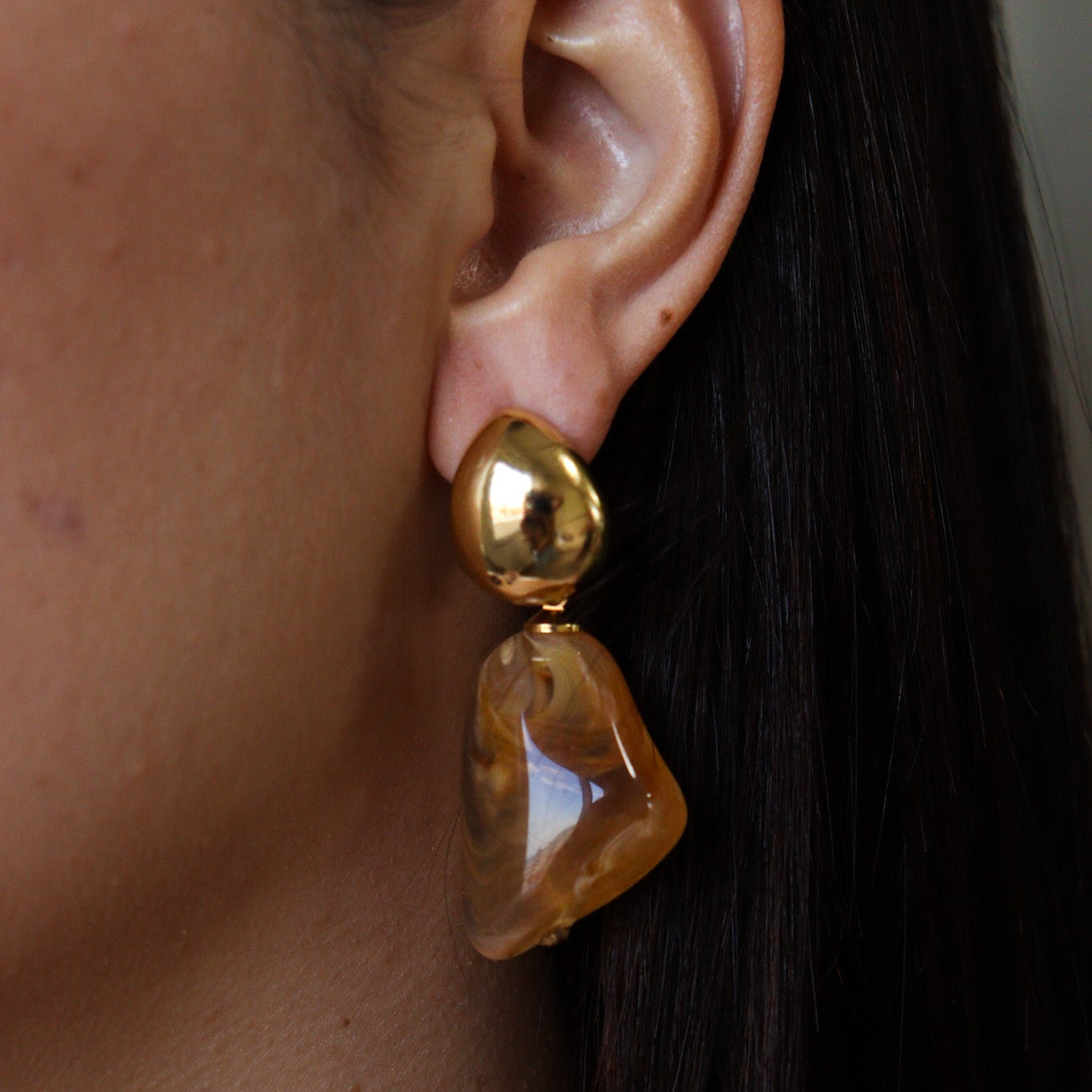 Descrição: Brinco de gota lisa com pedra em formato irregular caramelo