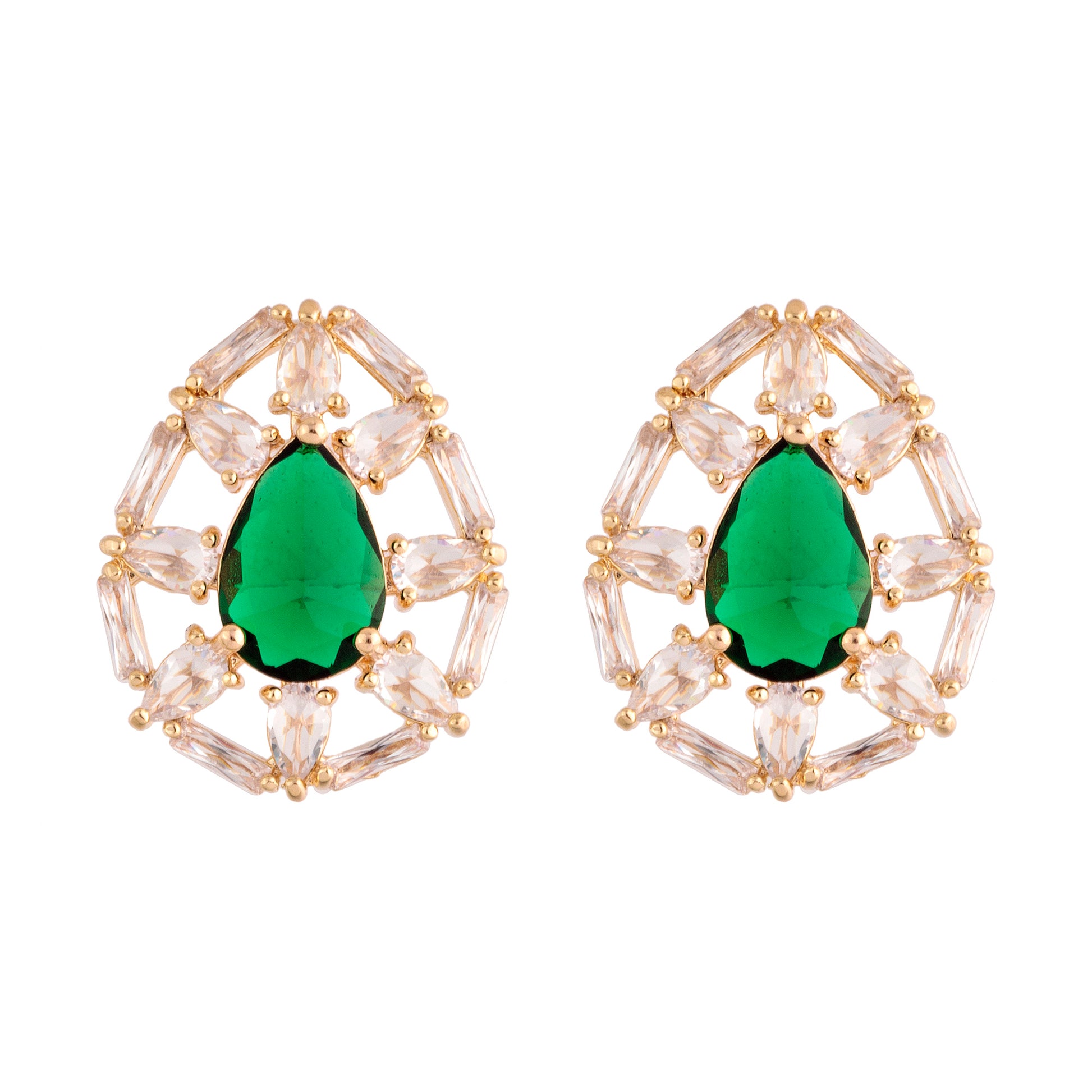 Descrição: Brinco em formato de gota cravejado em zircônia cristal, com gota menor no centro em tom esmeralda
