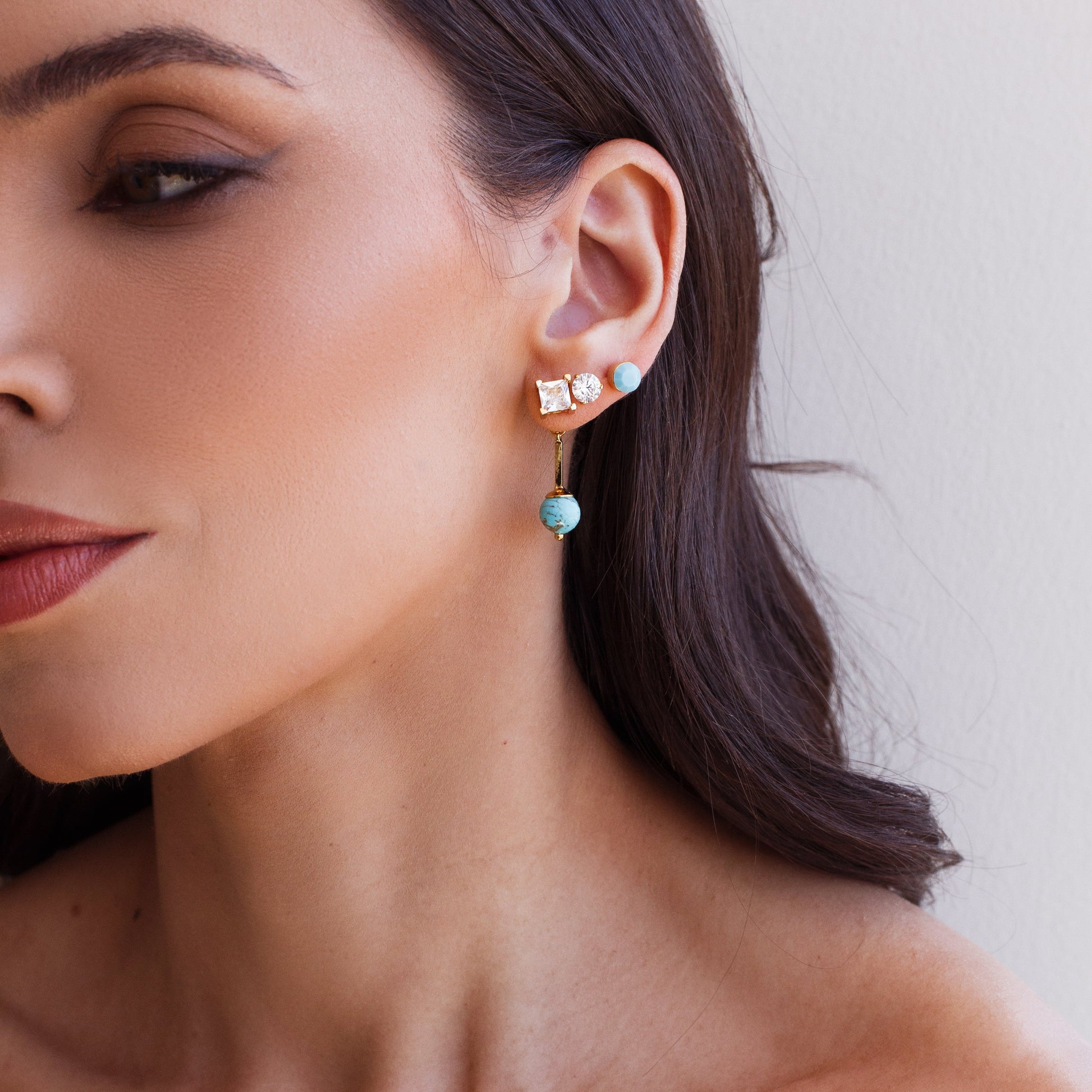 Descrição: Trio de brincos composto por ponto de luz quadrado cristal, tarraxa em cano dourado com esfera turquesa na ponta e ponto de luz em cristal turquesa