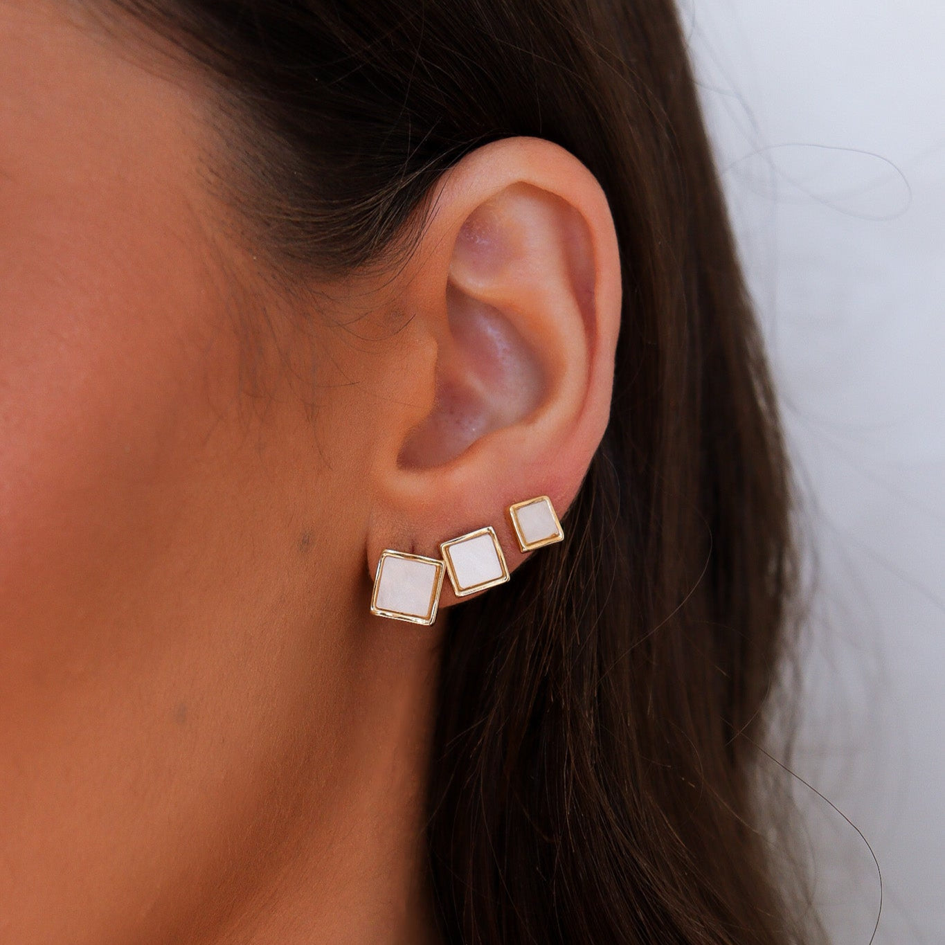 Descrição: Trio de brincos em formato quadrado com madrepérola