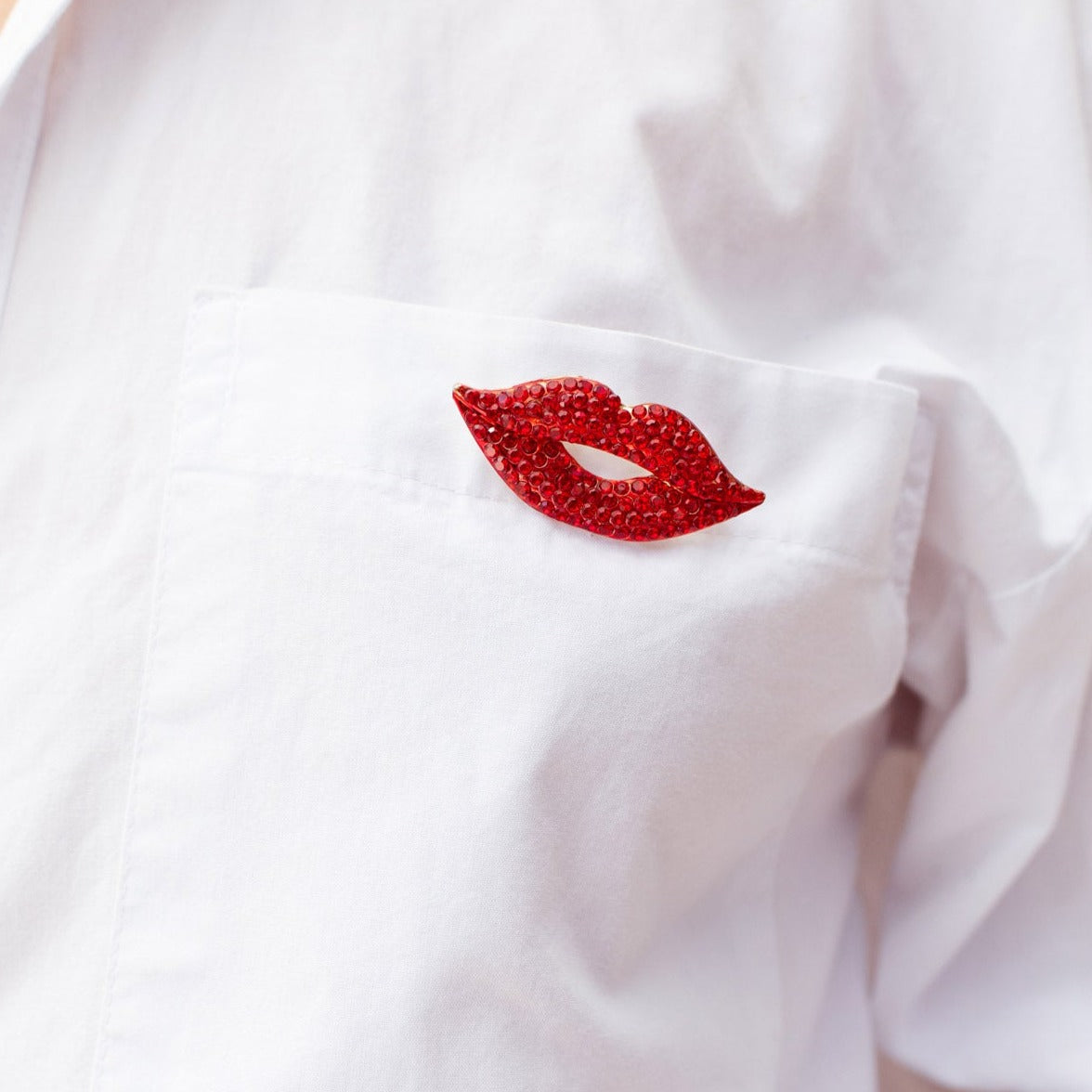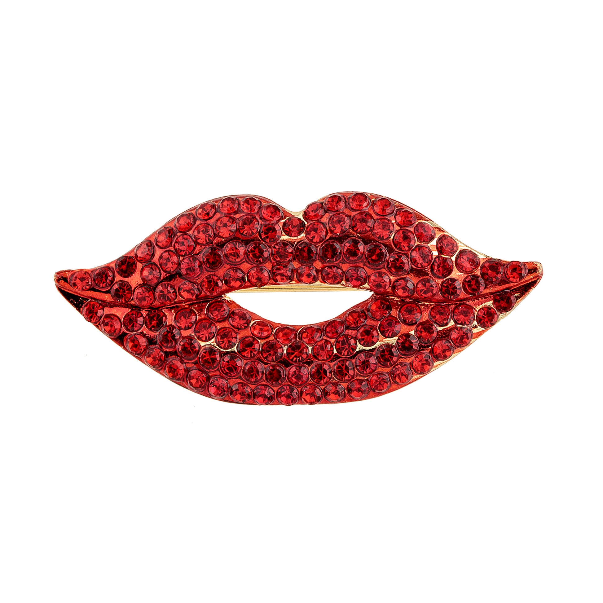 Descrição: Broche com fecho pregadeira e formato de boca. Possuí acabamentos em dourado, resina vermelha e strass.