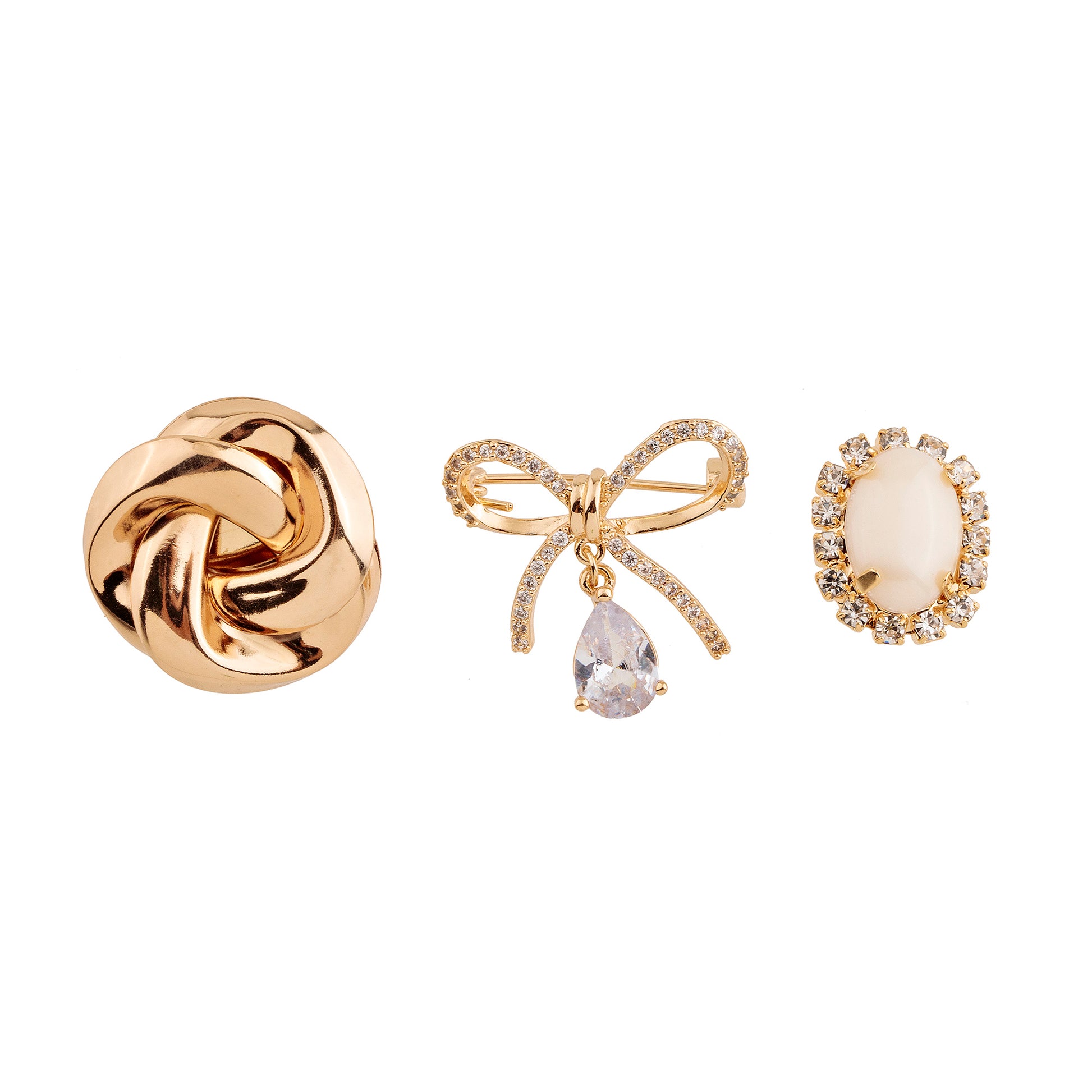 Descrição: Trio de broches com fecho pregadeira, cravejado em strass cristal, com pedra perolada e acabamentos em dourado.