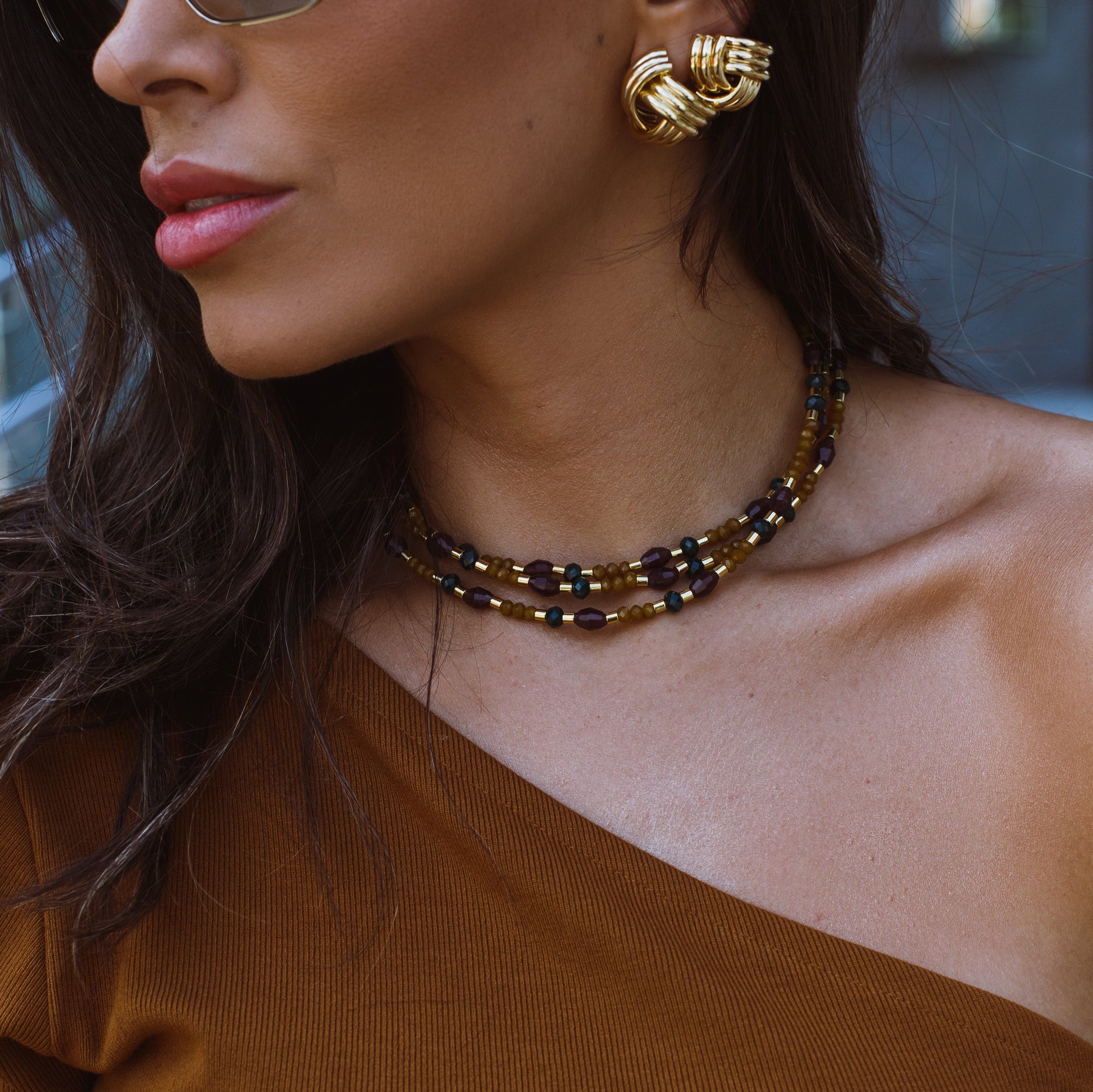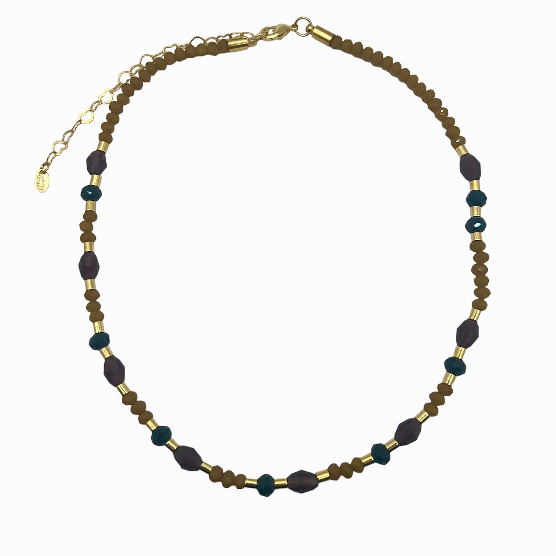 Colar Cristais Mostarda e Detalhes em Vinho e Verde Dourado