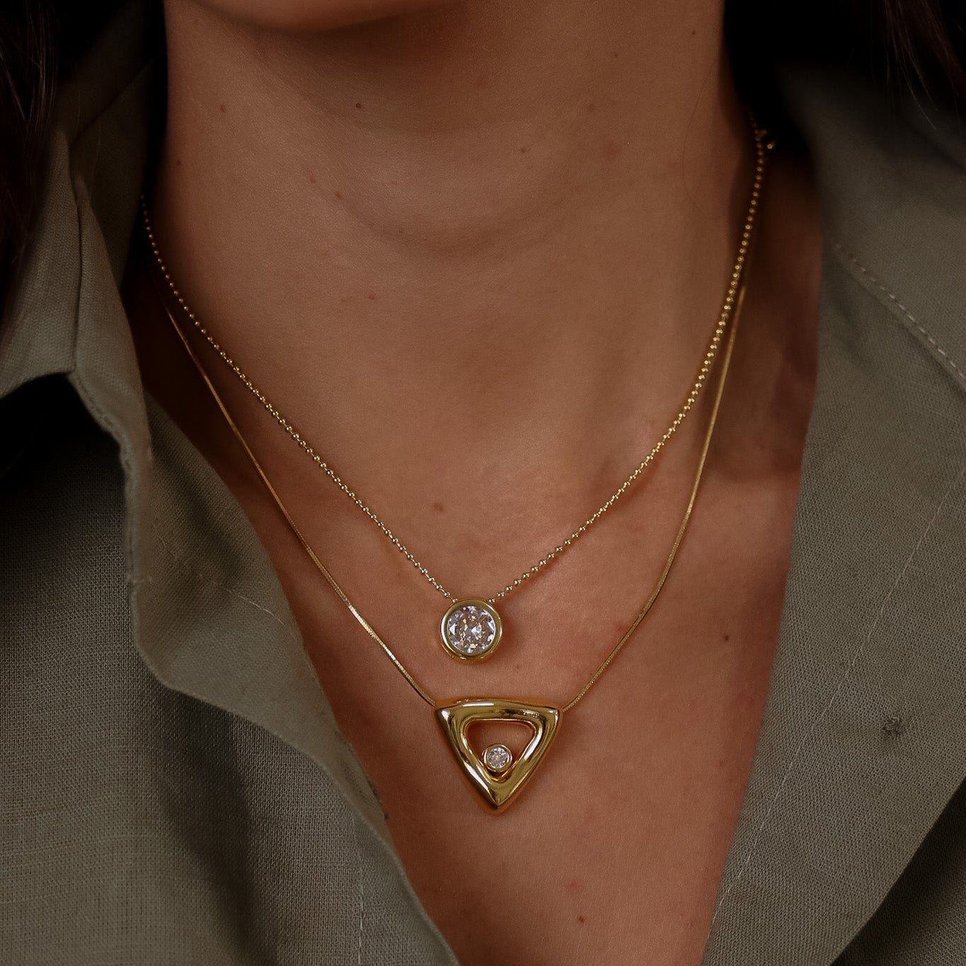 A peça conta com duas correntes delicadas: uma com pingente redondo de zircônia cristal e outra com pingente triangular geométrico vazado, também com detalhe em zircônia.