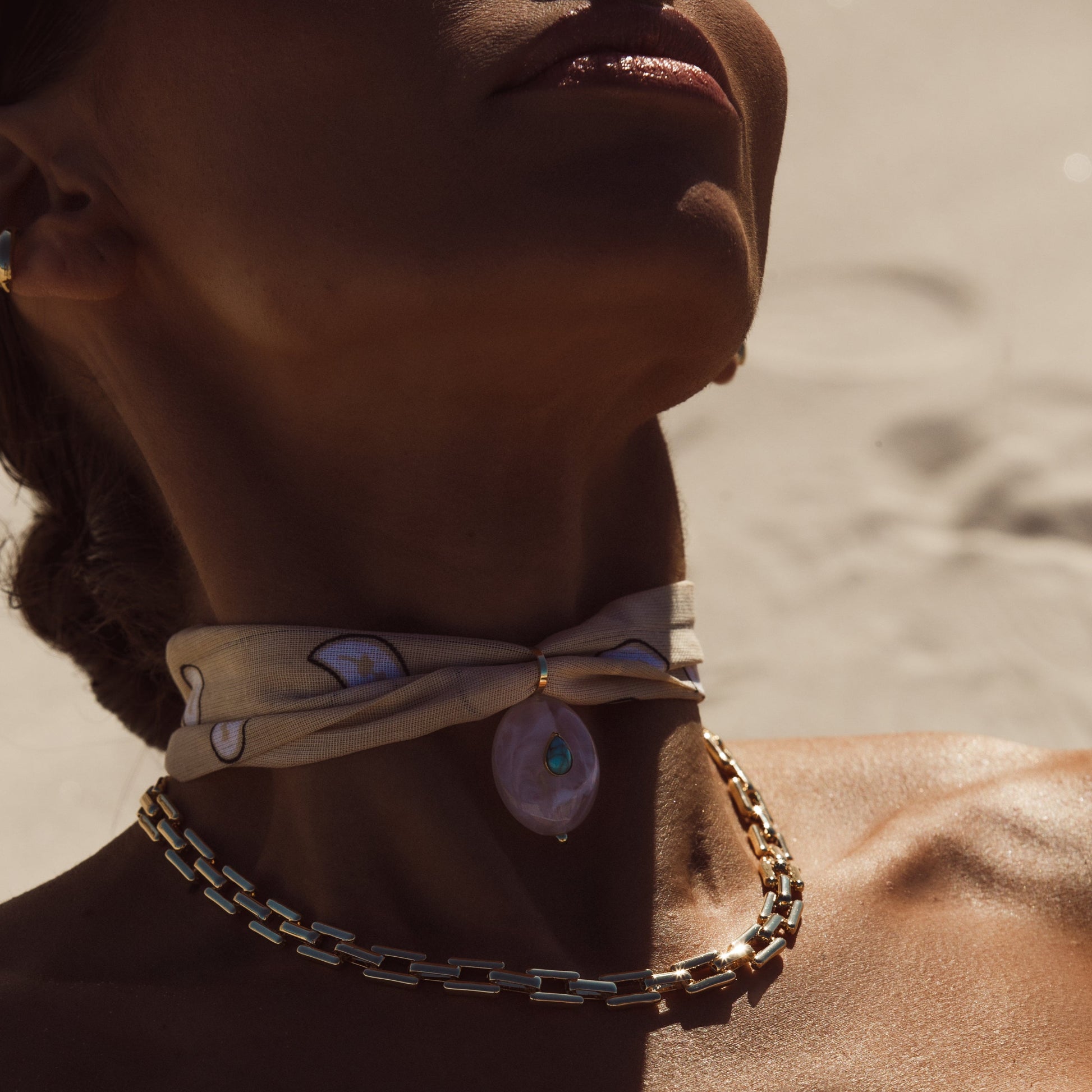 O Colar Lenço Creme com Pedra Resina Branca e Gota Turquesa Dourado é um acessório delicado e sofisticado, perfeito para quem busca um toque de originalidade. Confeccionado em tecido bege com estampa sutil, ele traz um pingente de madrepérola com detalhe central que realça a sua beleza natural. Versátil e estiloso, pode ser usado tanto em produções casuais quanto em looks mais elegantes, garantindo charme e exclusividade.