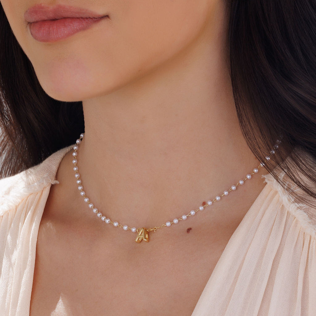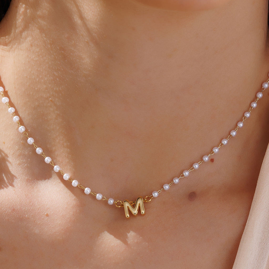 Descrição: Colar confeccionado me pérolas com pingente de letra liso