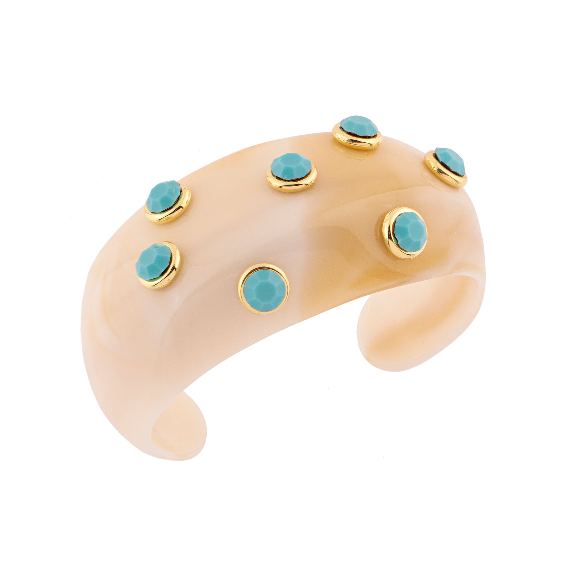 Pulseira Bracelete Resina Creme com Aplicação de Cristais Turquesa Dourado Nat Mosca