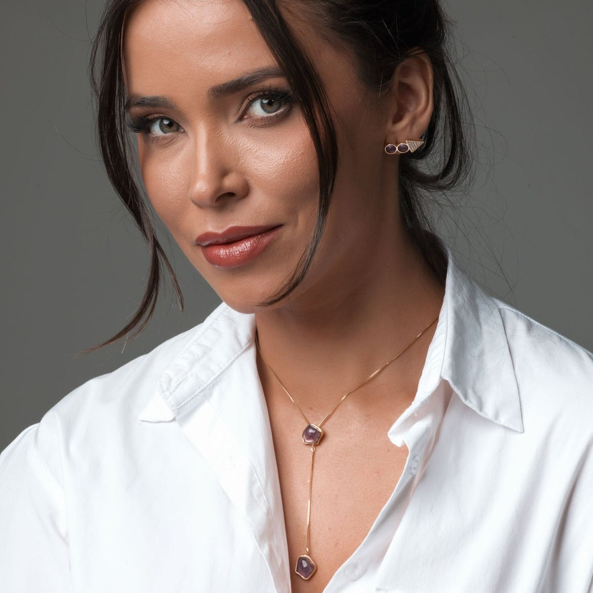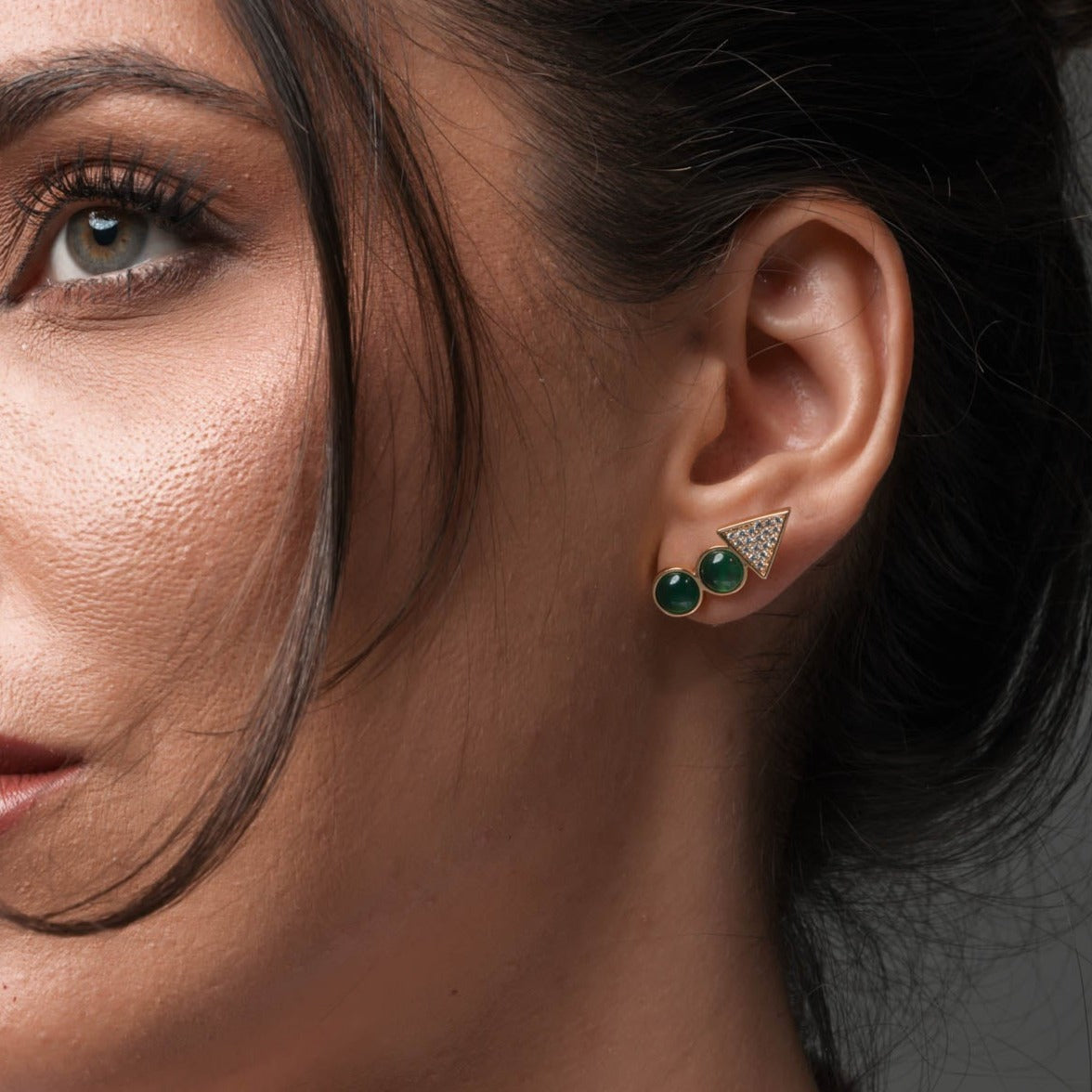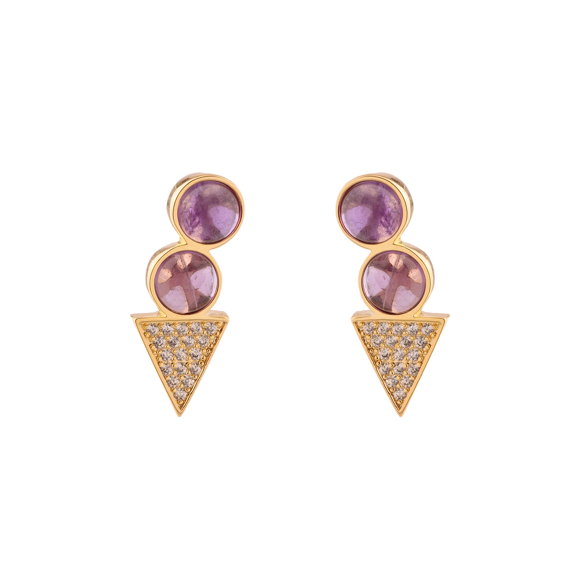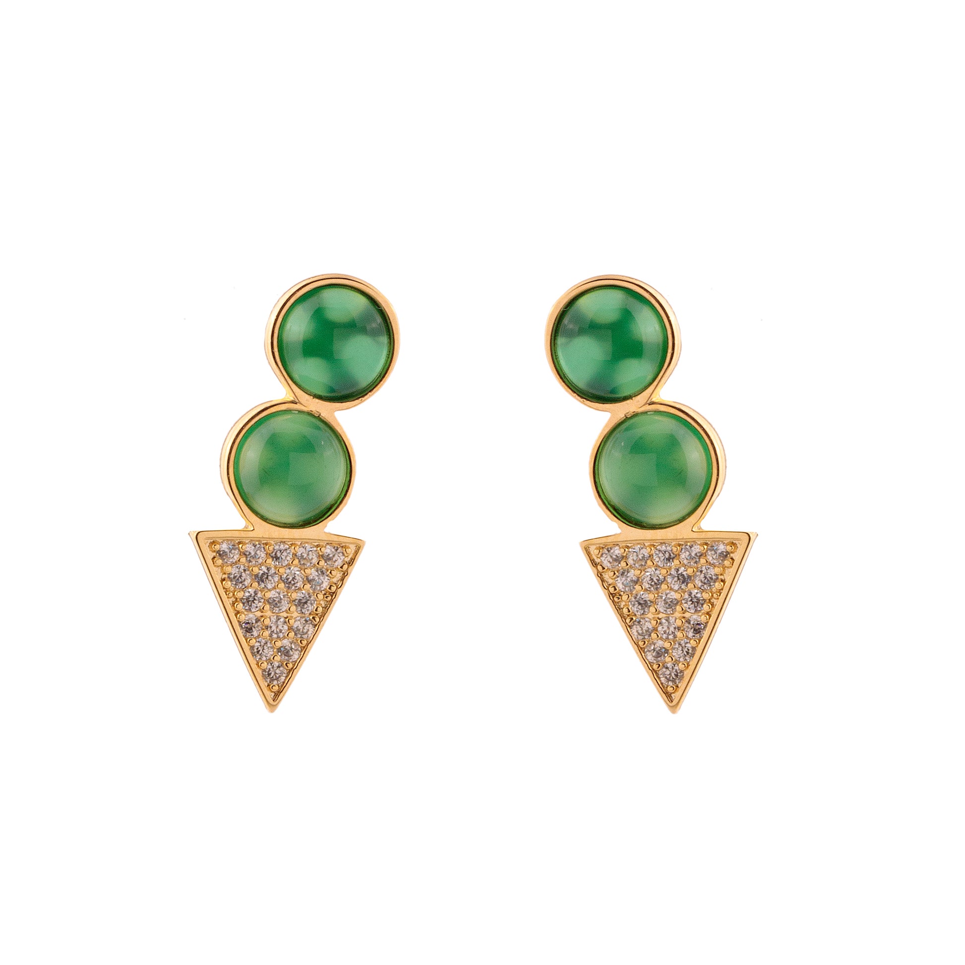 Descrição: Brinco composto por ovais em pedra natural e peça triangular cravejada em zircônia cristal. Todos os acabamentos em dourado.