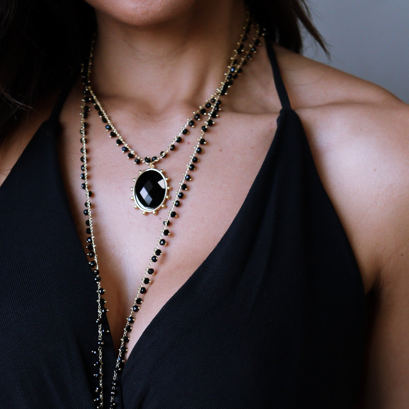 Descrição: Colar em cristais com pingente de pedra oval em tom preto