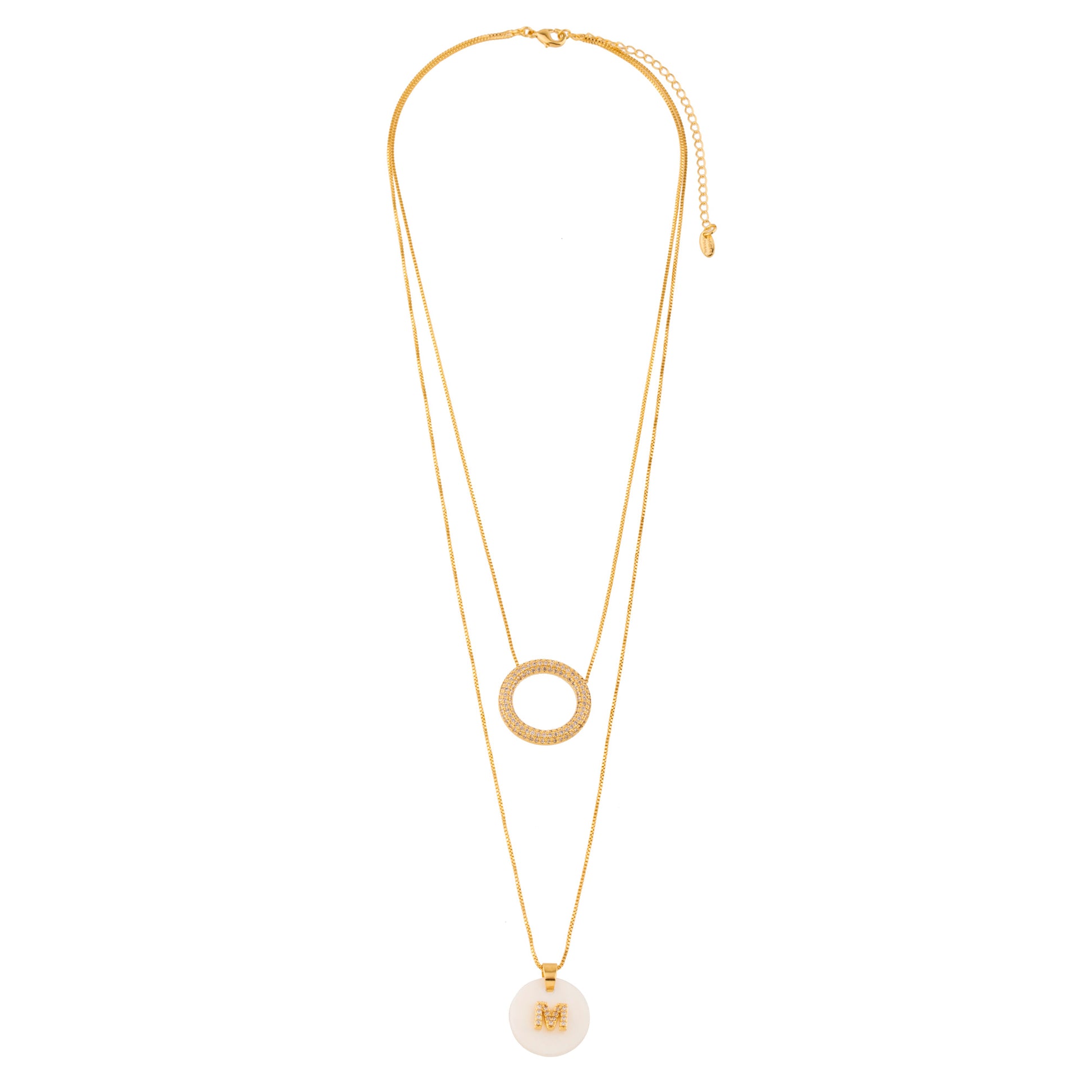 Descrição: Colar com oval cravejado em zircônia cristal e base em madrepérola com letra cravejada.